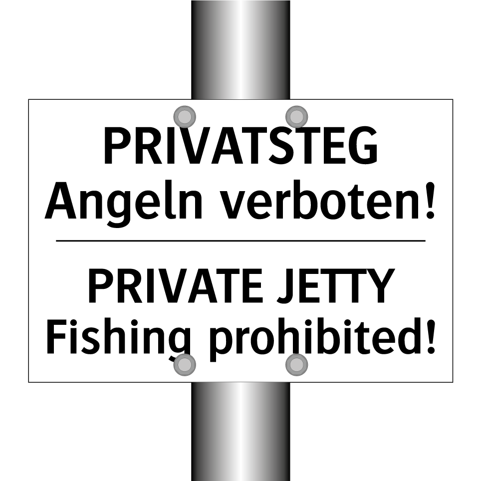 Zweisprachiges Verbotsschild mit deutschem Text PRIVATSTEG Angeln verboten! und englischem Text PRIVATE JETTY Fishing prohibited!