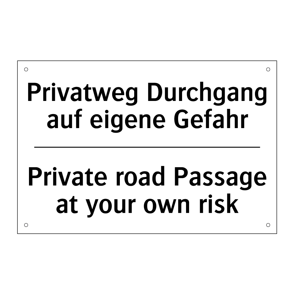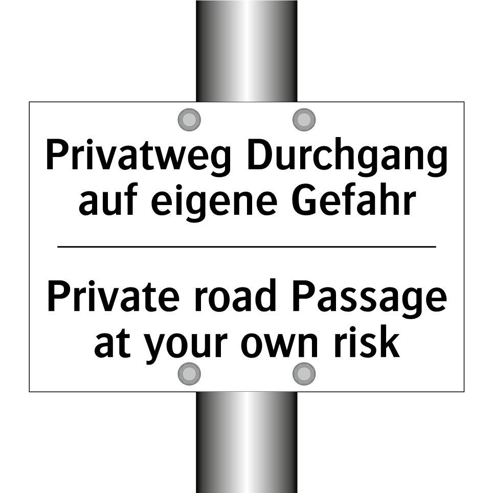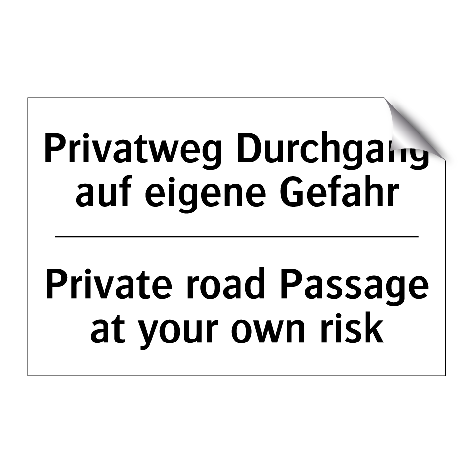 Zweisprachiges Verbotsschild mit deutschem Text Privatweg Durchgang auf eigene Gefahr und englischem Text Private road Passage at your own risk