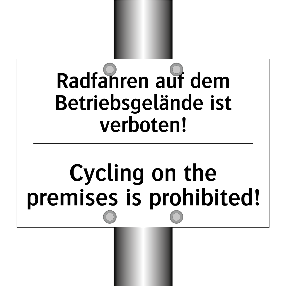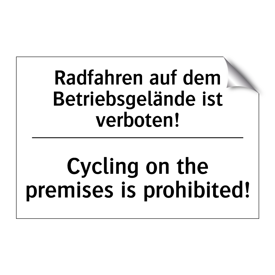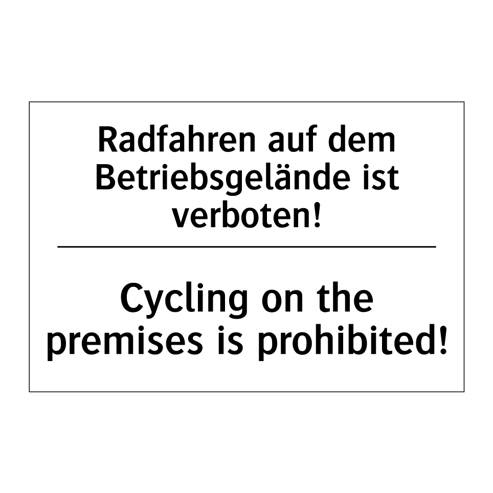 Zweisprachiges Verbotsschild mit deutschem Text Radfahren auf dem Betriebsgelände ist verboten! und englischem Text Cycling on the premises is prohibited!