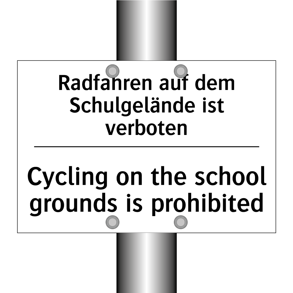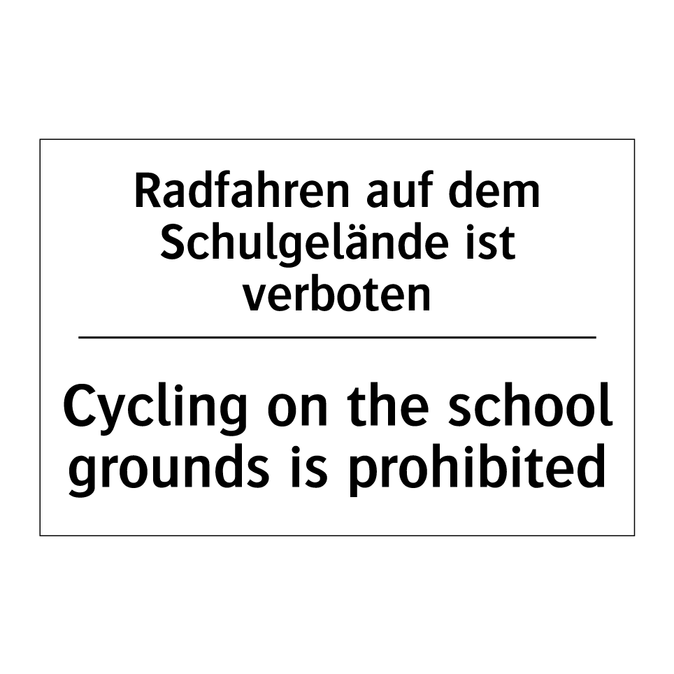 Zweisprachiges Verbotsschild mit deutschem Text Radfahren auf dem Schulgelände ist verboten und englischem Text Cycling on the school grounds is prohibited
