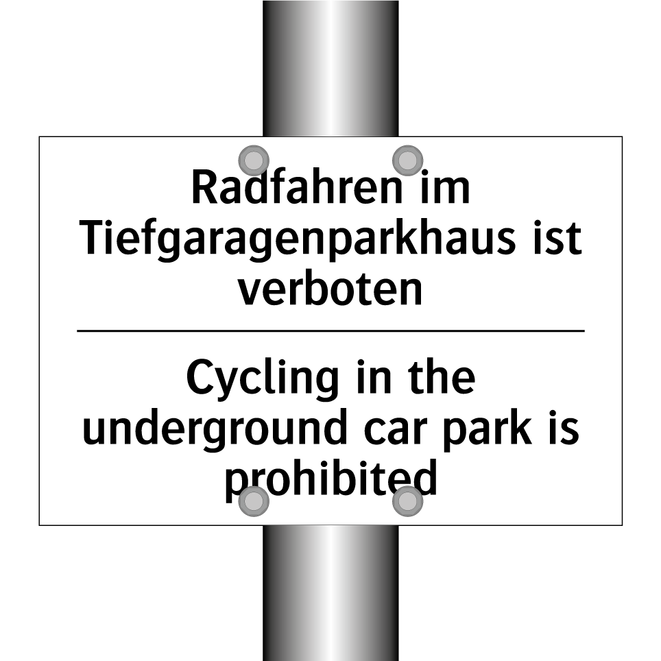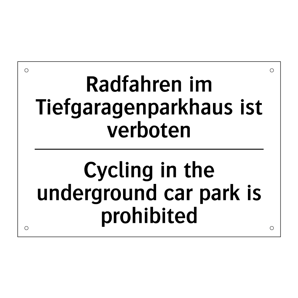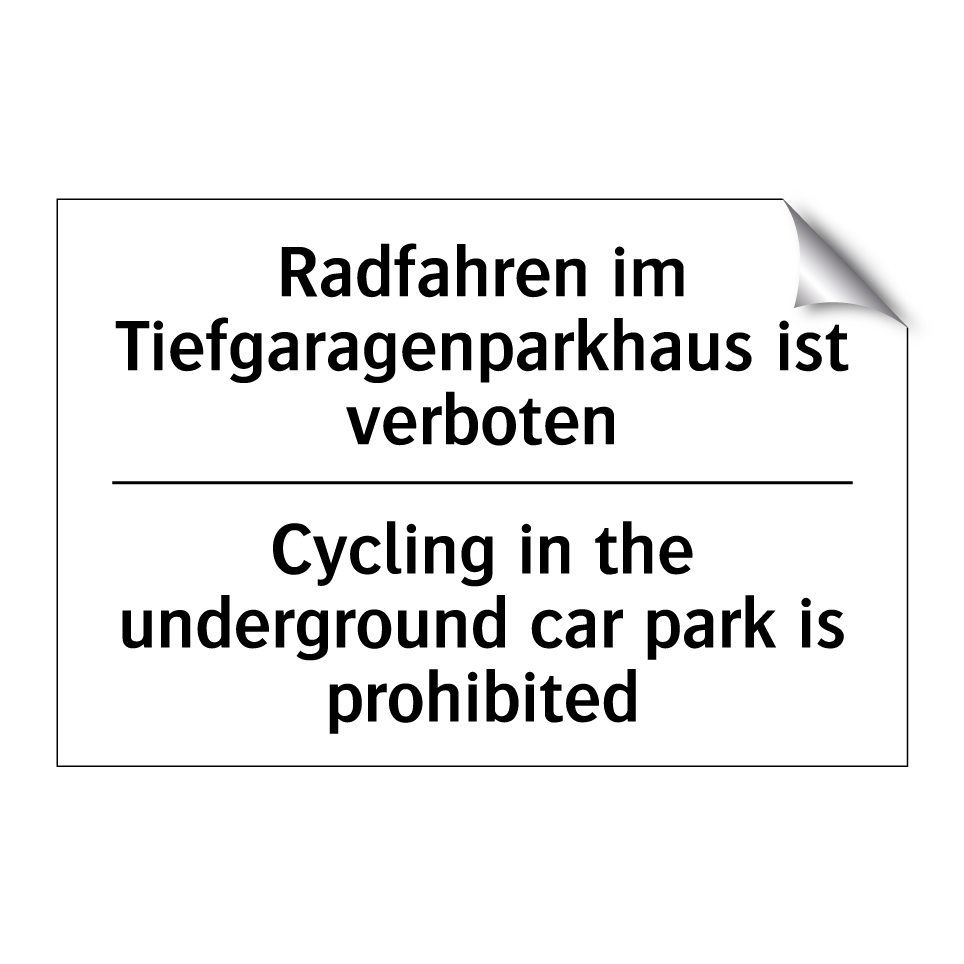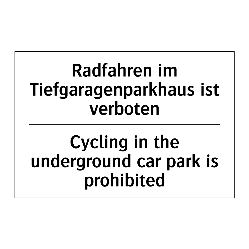 Zweisprachiges Verbotsschild mit deutschem Text Radfahren im Tiefgaragenparkhaus ist verboten und englischem Text Cycling in the underground car park is prohibited