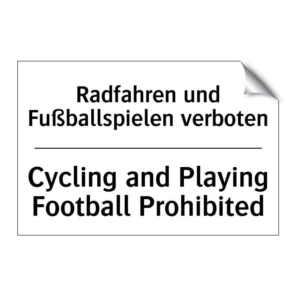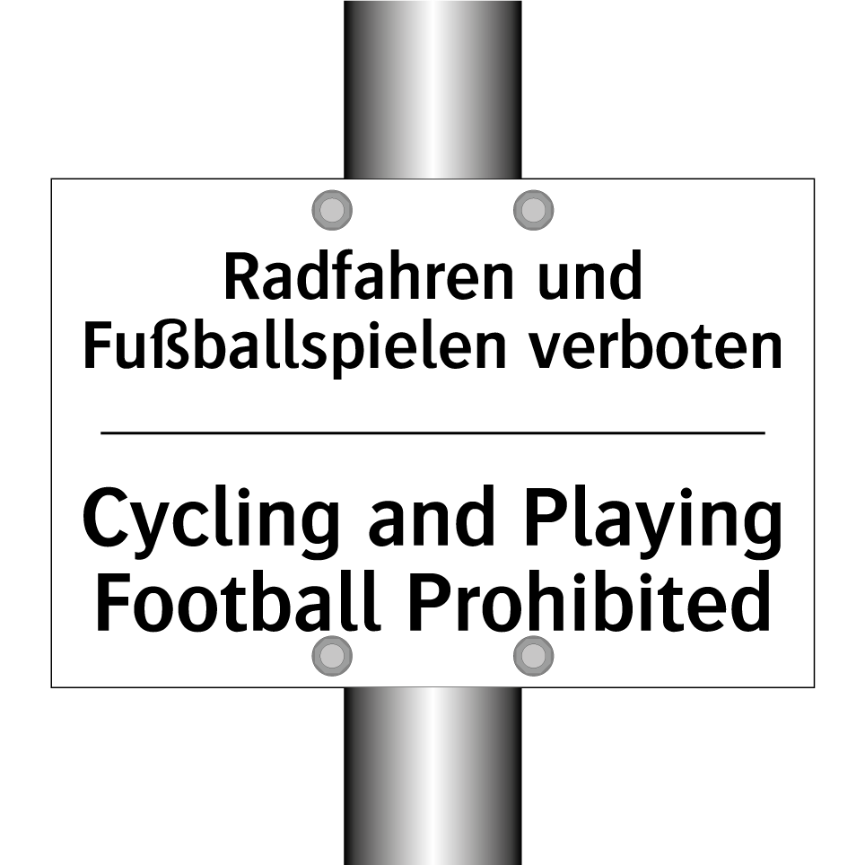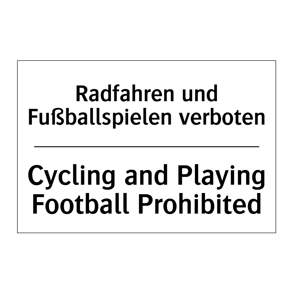 Zweisprachiges Verbotsschild mit deutschem Text Radfahren und Fußballspielen verboten und englischem Text Cycling and Playing Football Prohibited