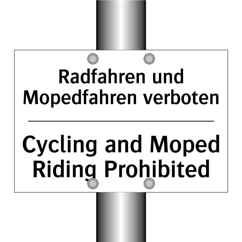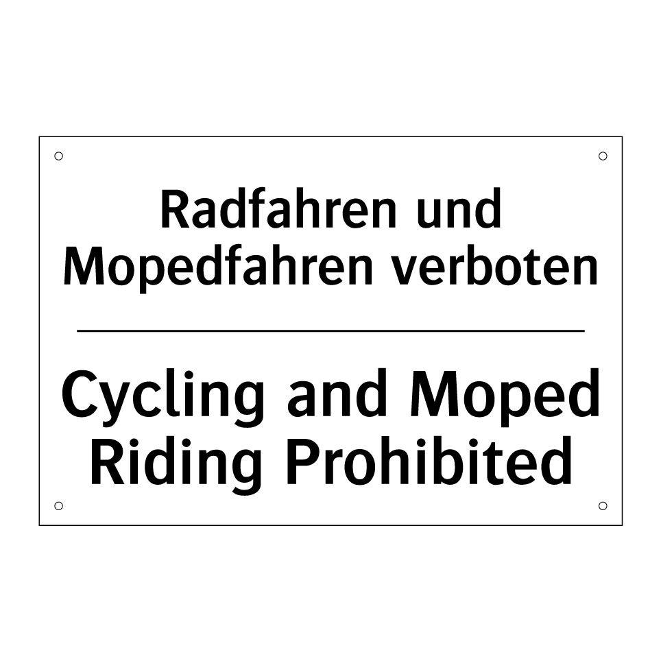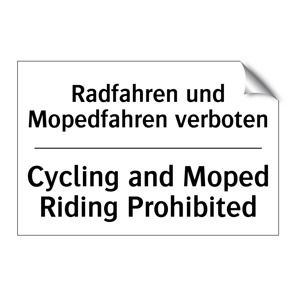 Zweisprachiges Verbotsschild mit deutschem Text Radfahren und Mopedfahren verboten und englischem Text Cycling and Moped Riding Prohibited