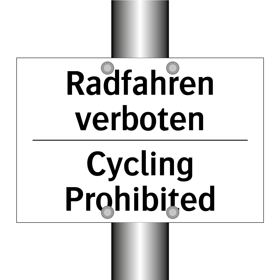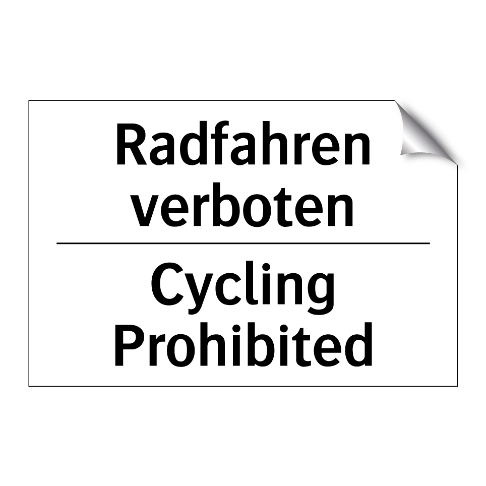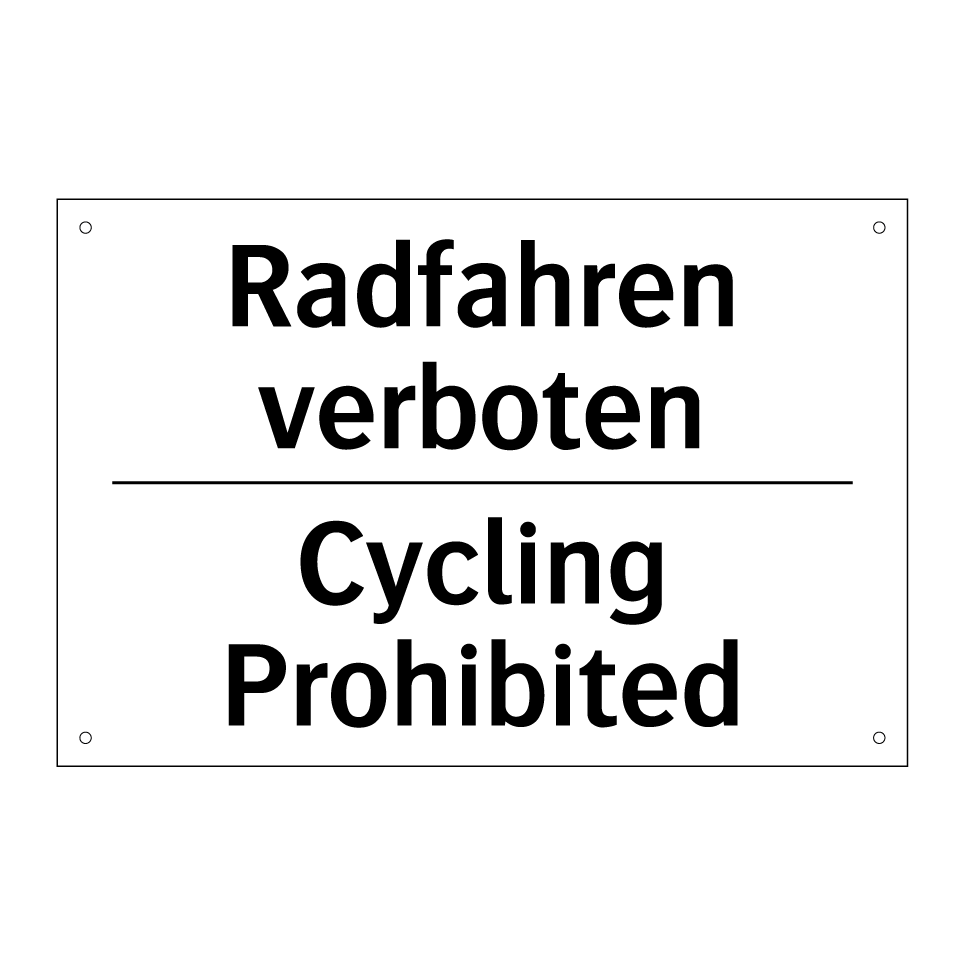 Zweisprachiges Verbotsschild mit deutschem Text Radfahren verboten und englischem Text Cycling Prohibited
