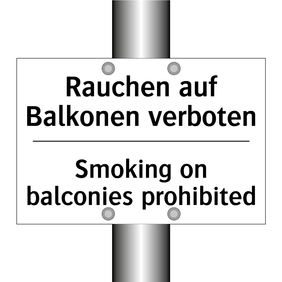 Zweisprachiges Verbotsschild mit deutschem Text Rauchen auf Balkonen verboten und englischem Text Smoking on balconies prohibited