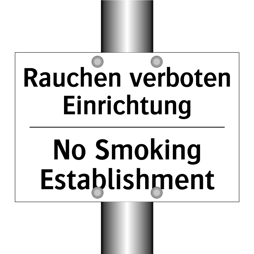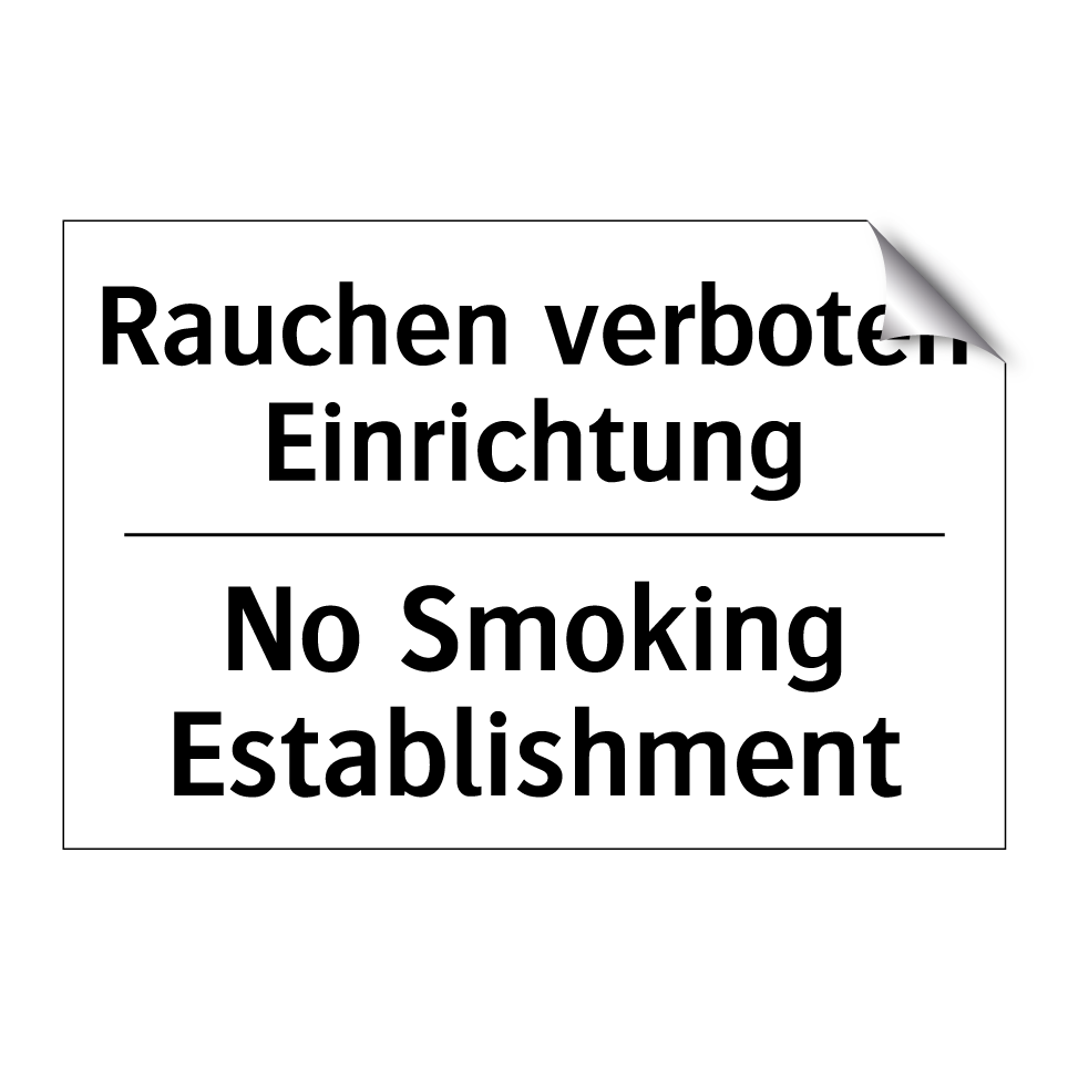Zweisprachiges Verbotsschild mit deutschem Text Rauchen verboten Einrichtung und englischem Text No Smoking Establishment