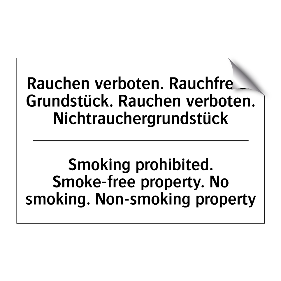 Zweisprachiges Verbotsschild mit deutschem Text Rauchen verboten. Rauchfreies Grundstück. Rauchen verboten. Nichtrauchergrundstück und englischem Text Smoking prohibited. Smoke-free property. No smoking. Non-smoking property
