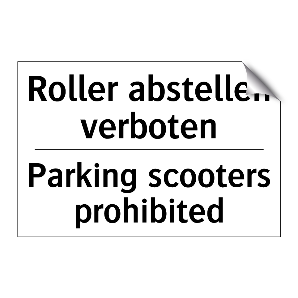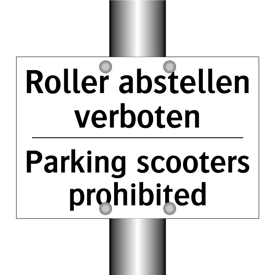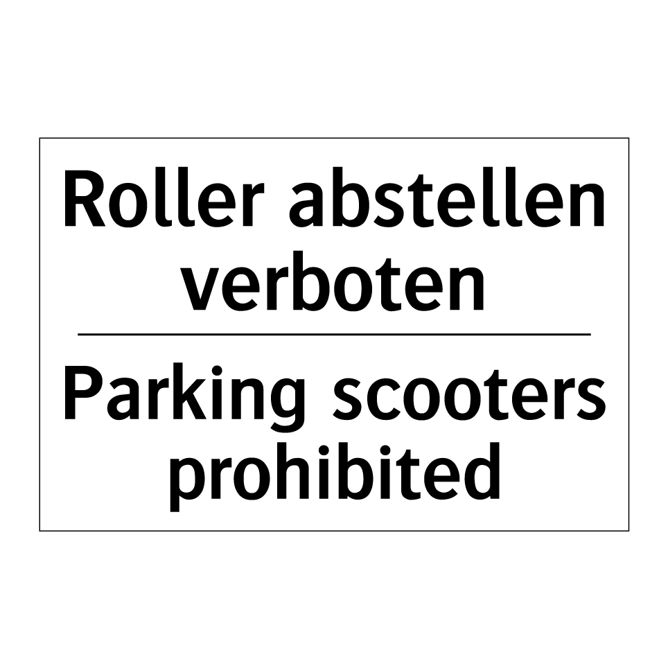 Zweisprachiges Verbotsschild mit deutschem Text Roller abstellen verboten und englischem Text Parking scooters prohibited