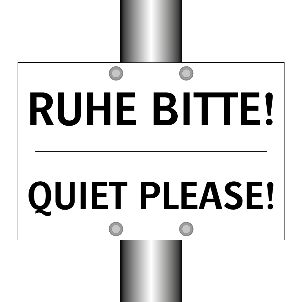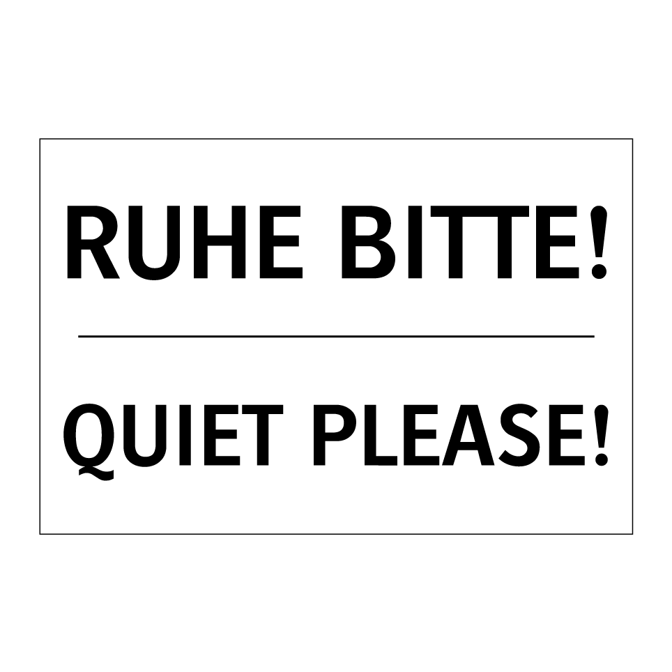 Zweisprachiges Verbotsschild mit deutschem Text RUHE BITTE! und englischem Text QUIET PLEASE!