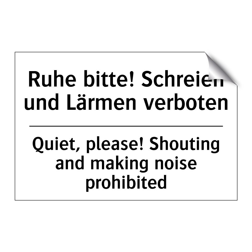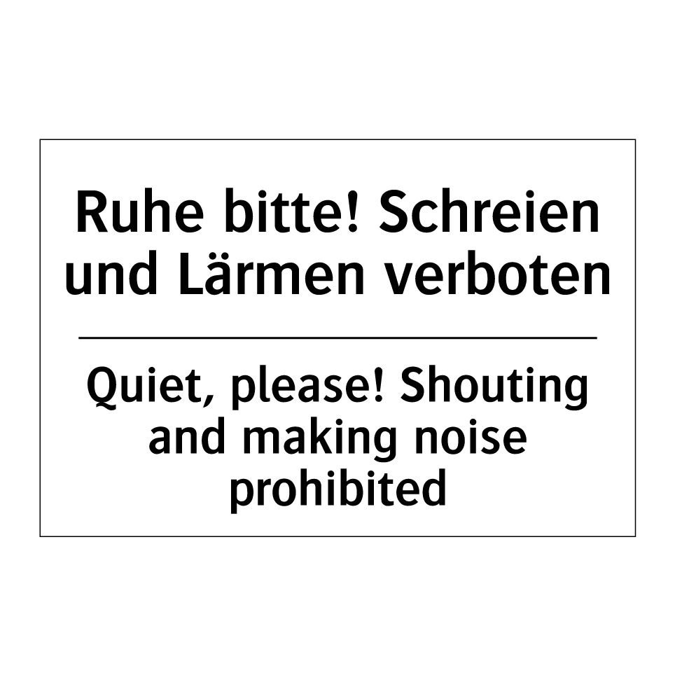 Zweisprachiges Verbotsschild mit deutschem Text Ruhe bitte! Schreien und Lärmen verboten und englischem Text Quiet, please! Shouting and making noise prohibited