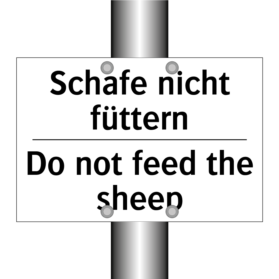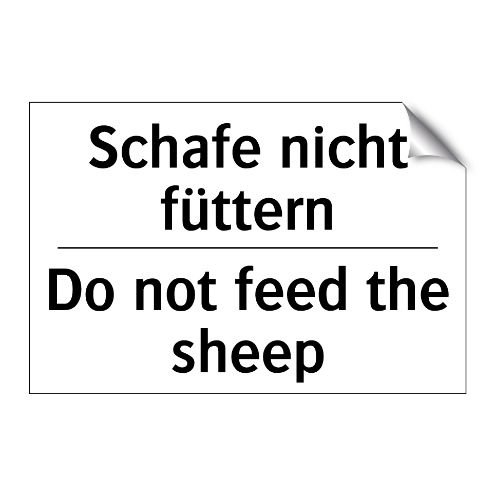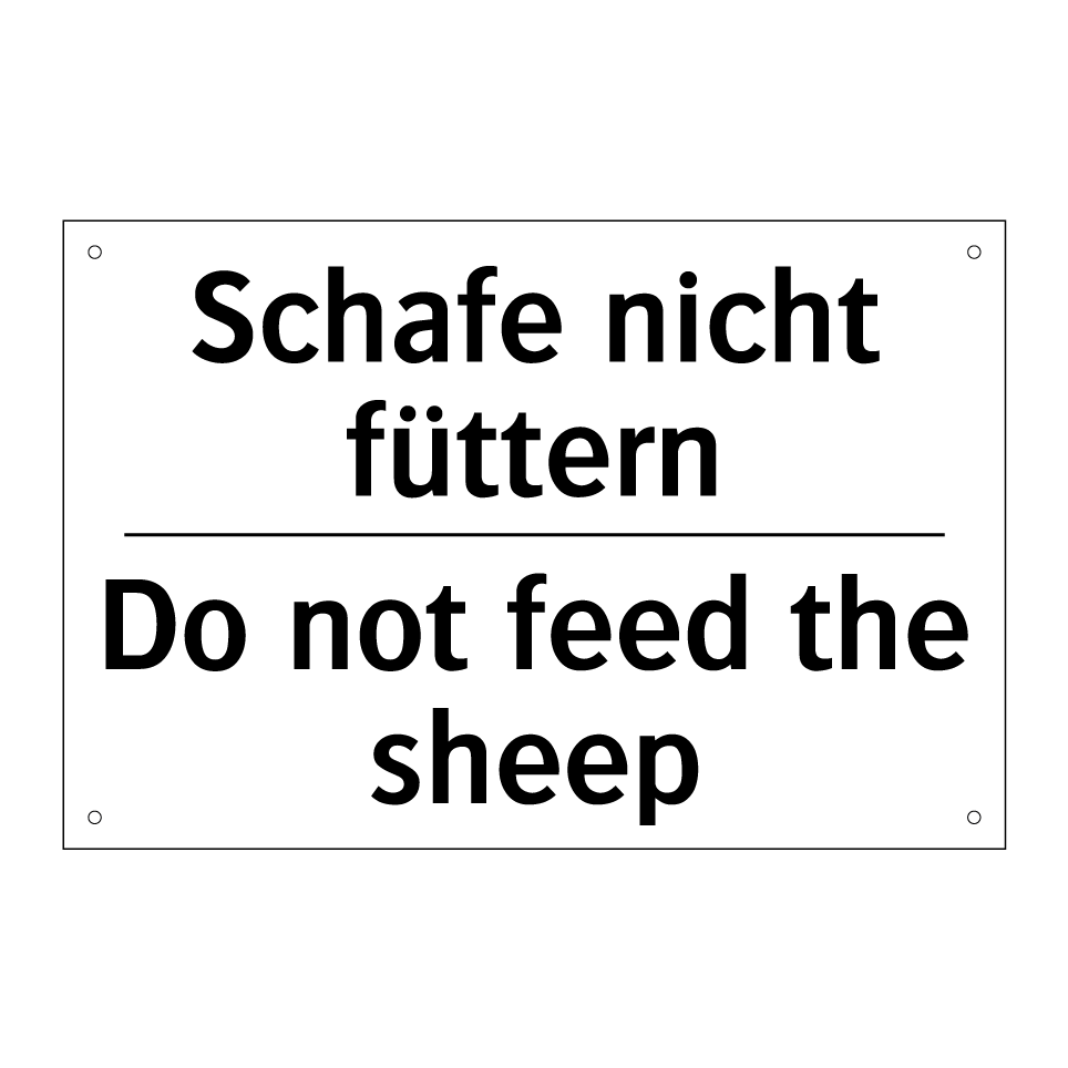 Zweisprachiges Verbotsschild mit deutschem Text Schafe nicht füttern und englischem Text Do not feed the sheep