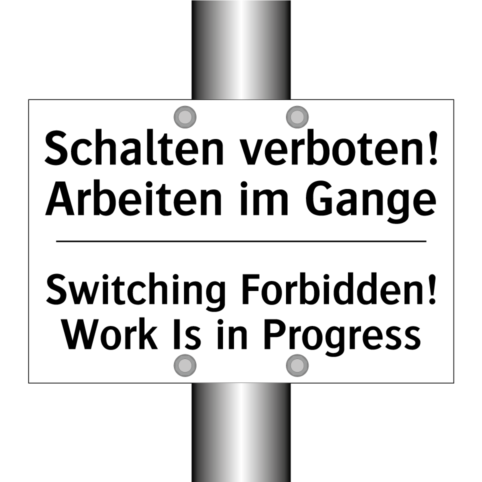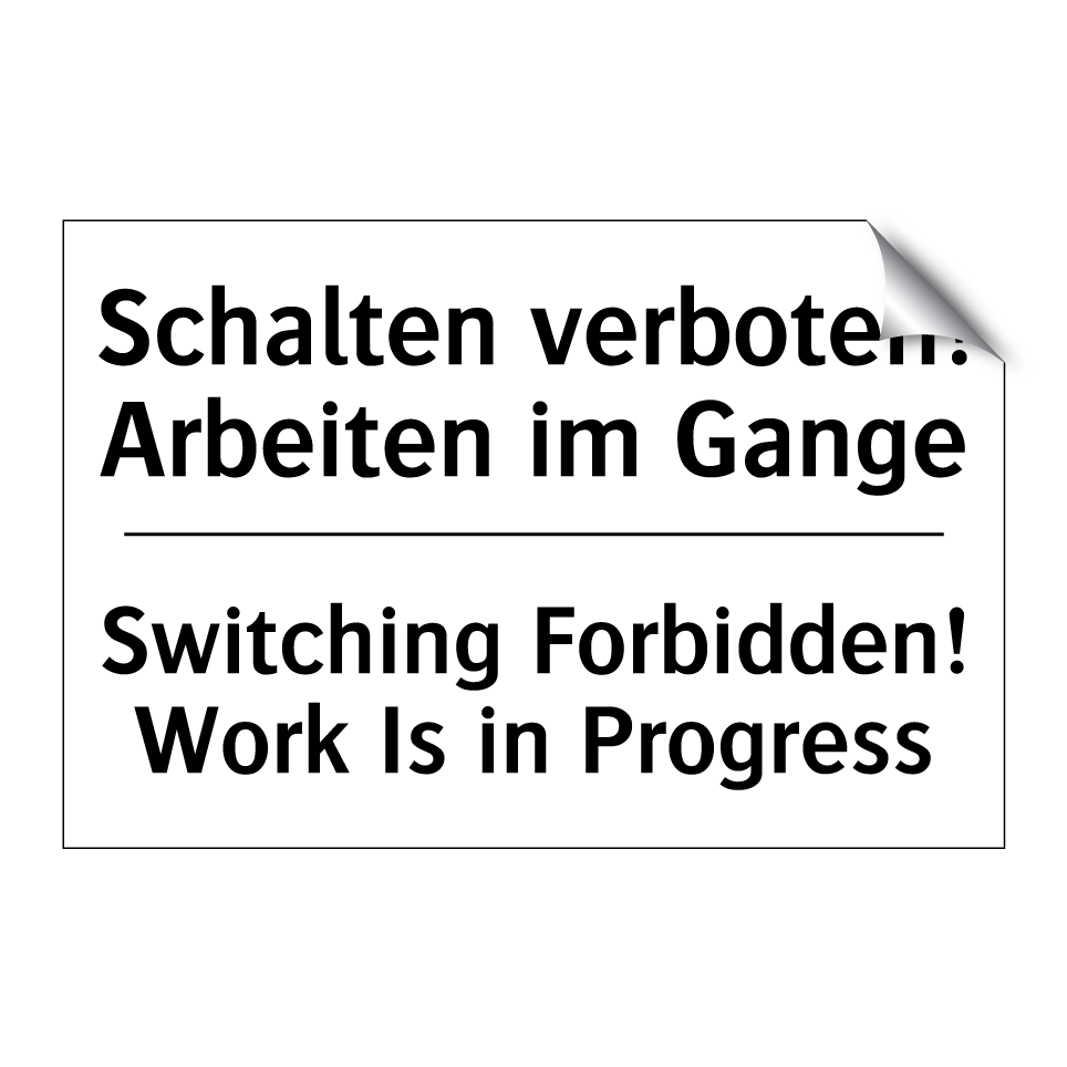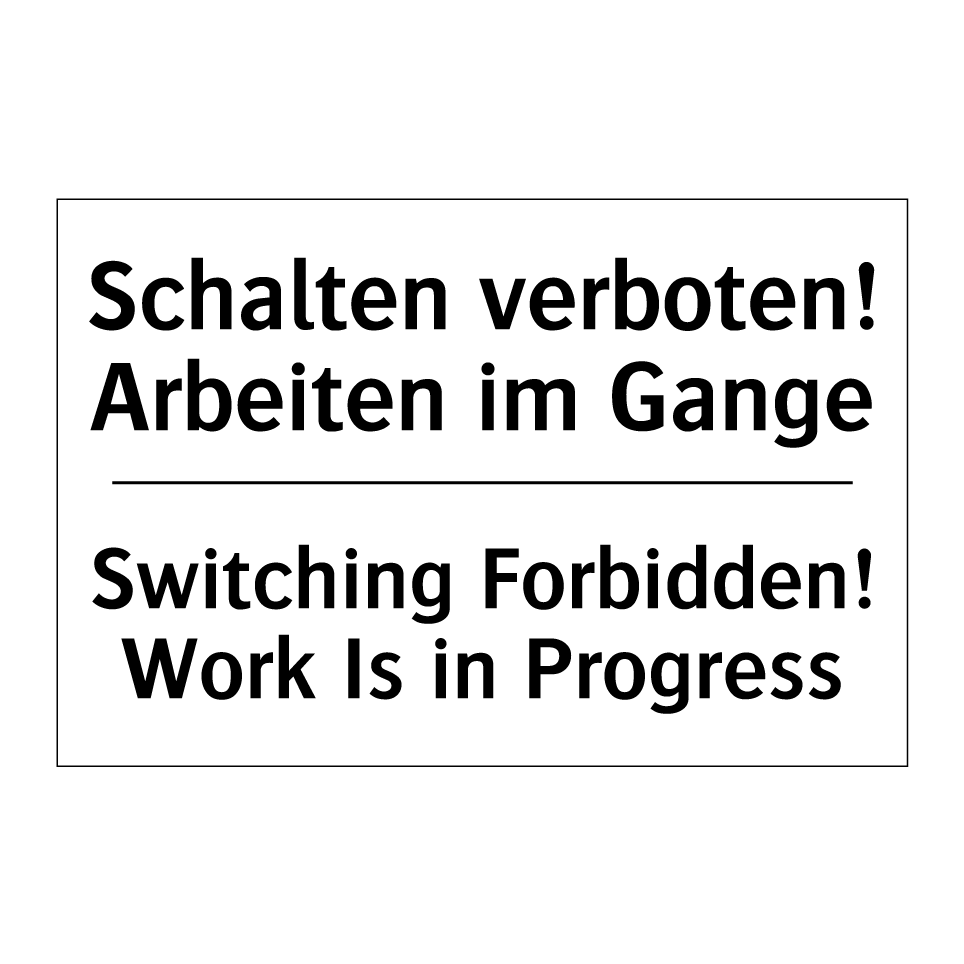Zweisprachiges Verbotsschild mit deutschem Text Schalten verboten! Arbeiten im Gange und englischem Text Switching Forbidden! Work Is in Progress