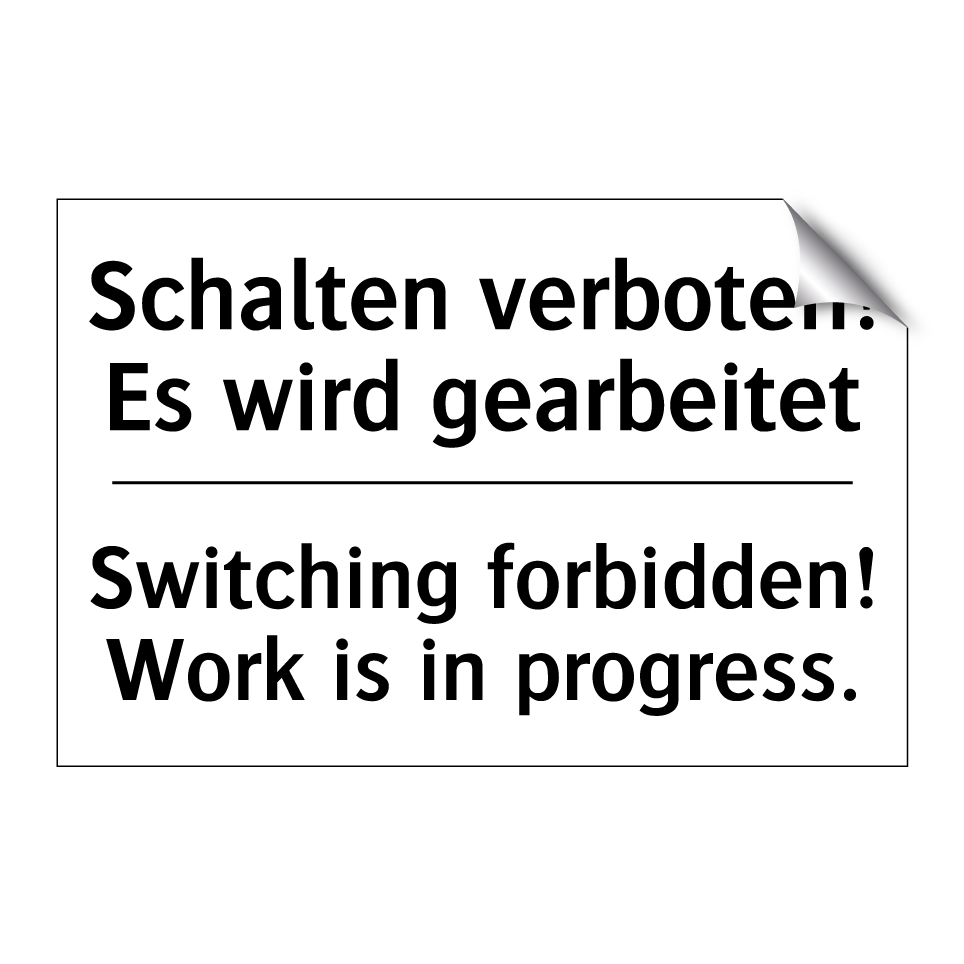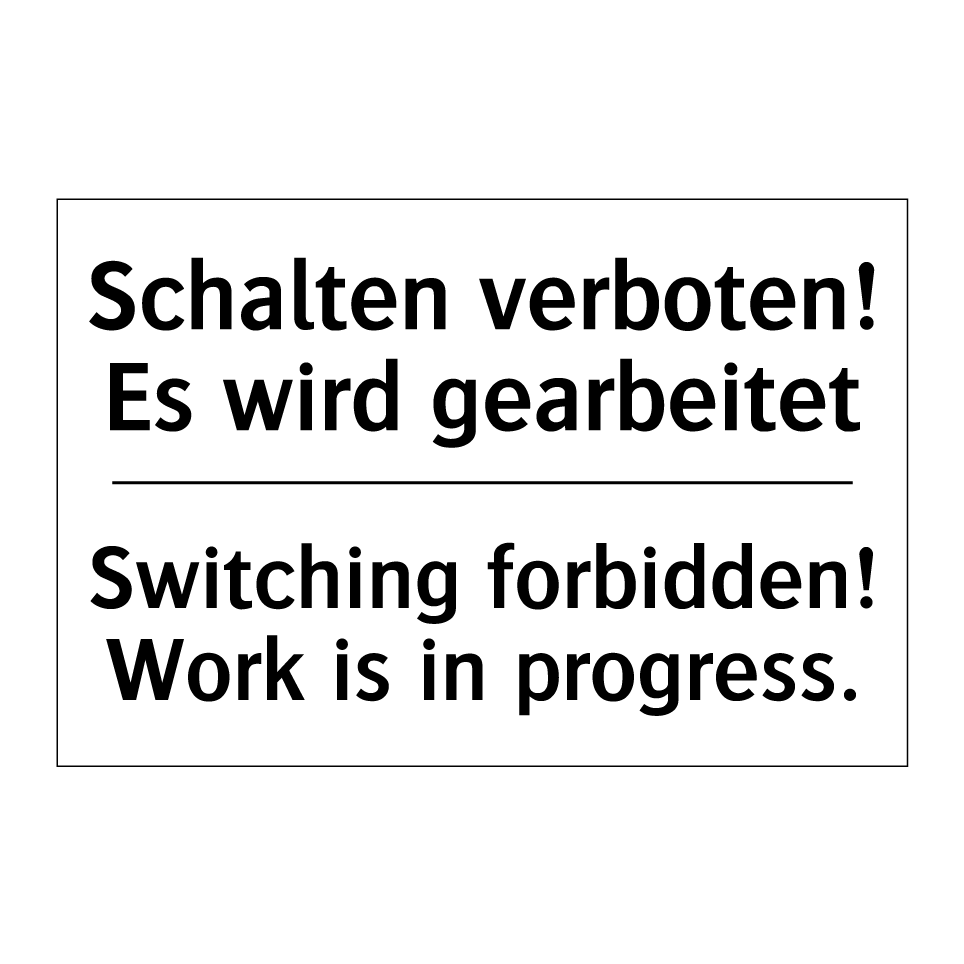 Zweisprachiges Verbotsschild mit deutschem Text Schalten verboten! Es wird gearbeitet und englischem Text Switching forbidden! Work is in progress.