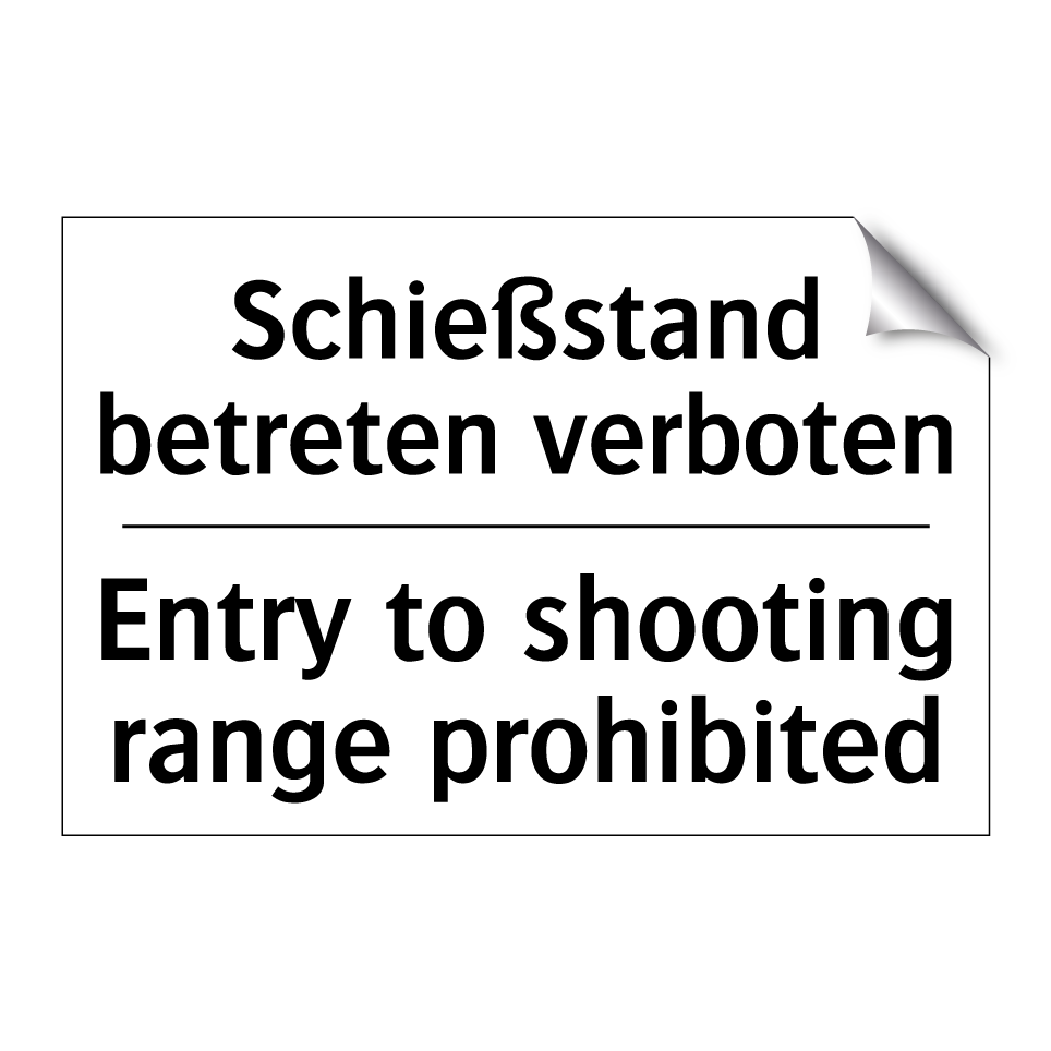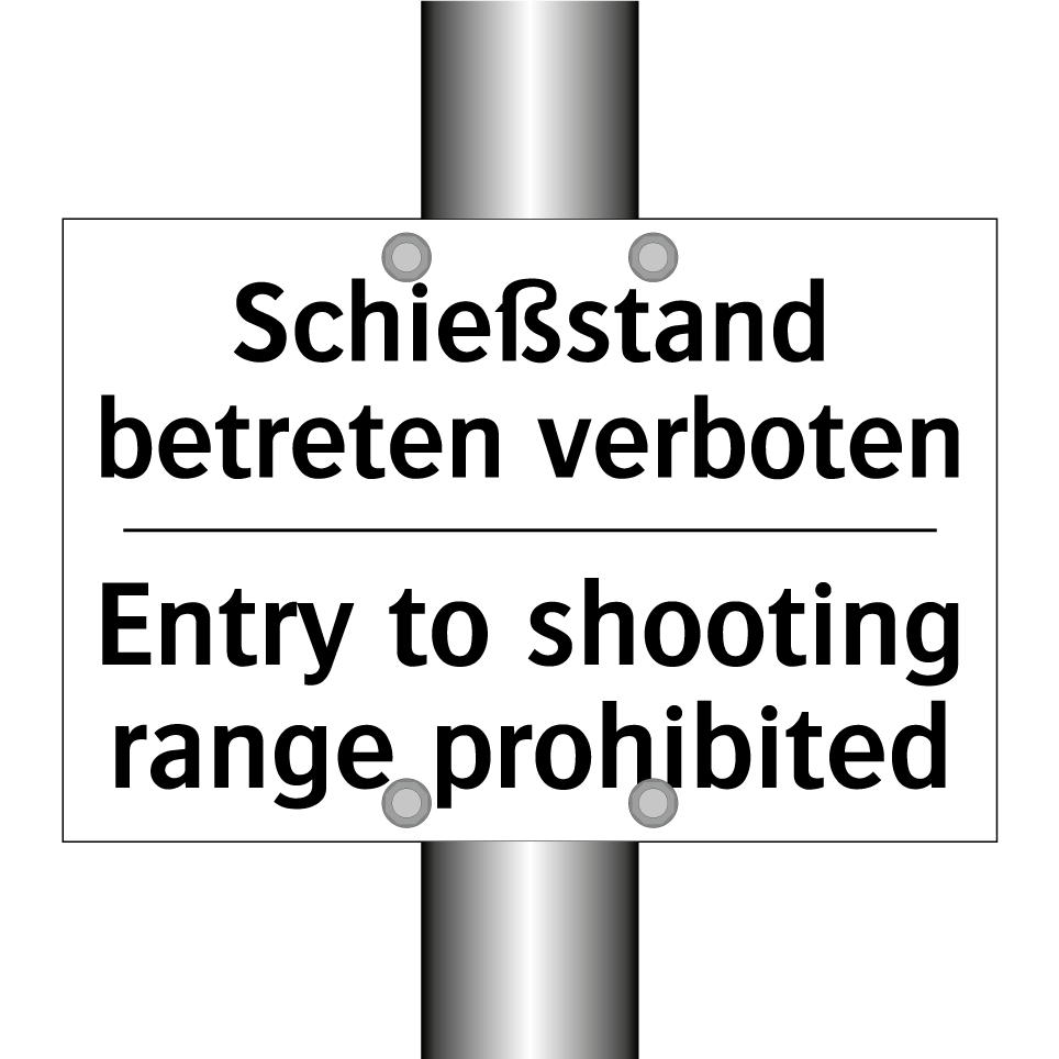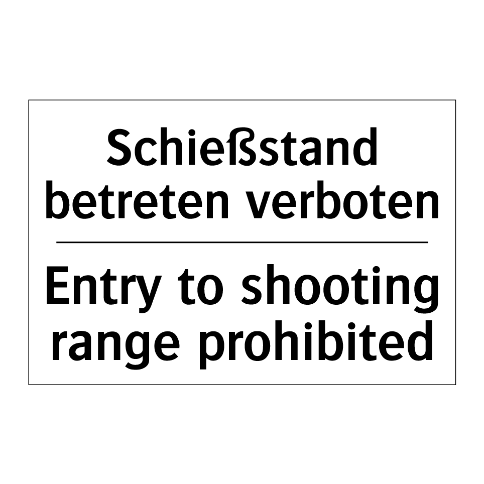 Zweisprachiges Verbotsschild mit deutschem Text Schießstand betreten verboten und englischem Text Entry to shooting range prohibited