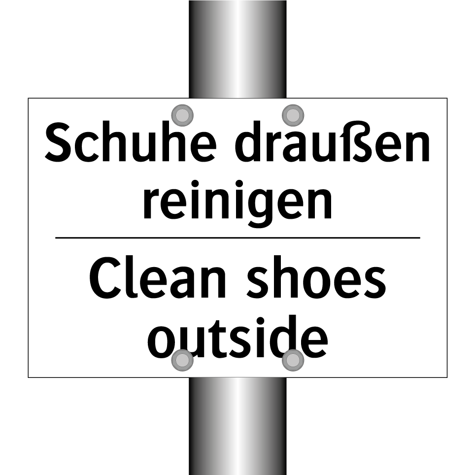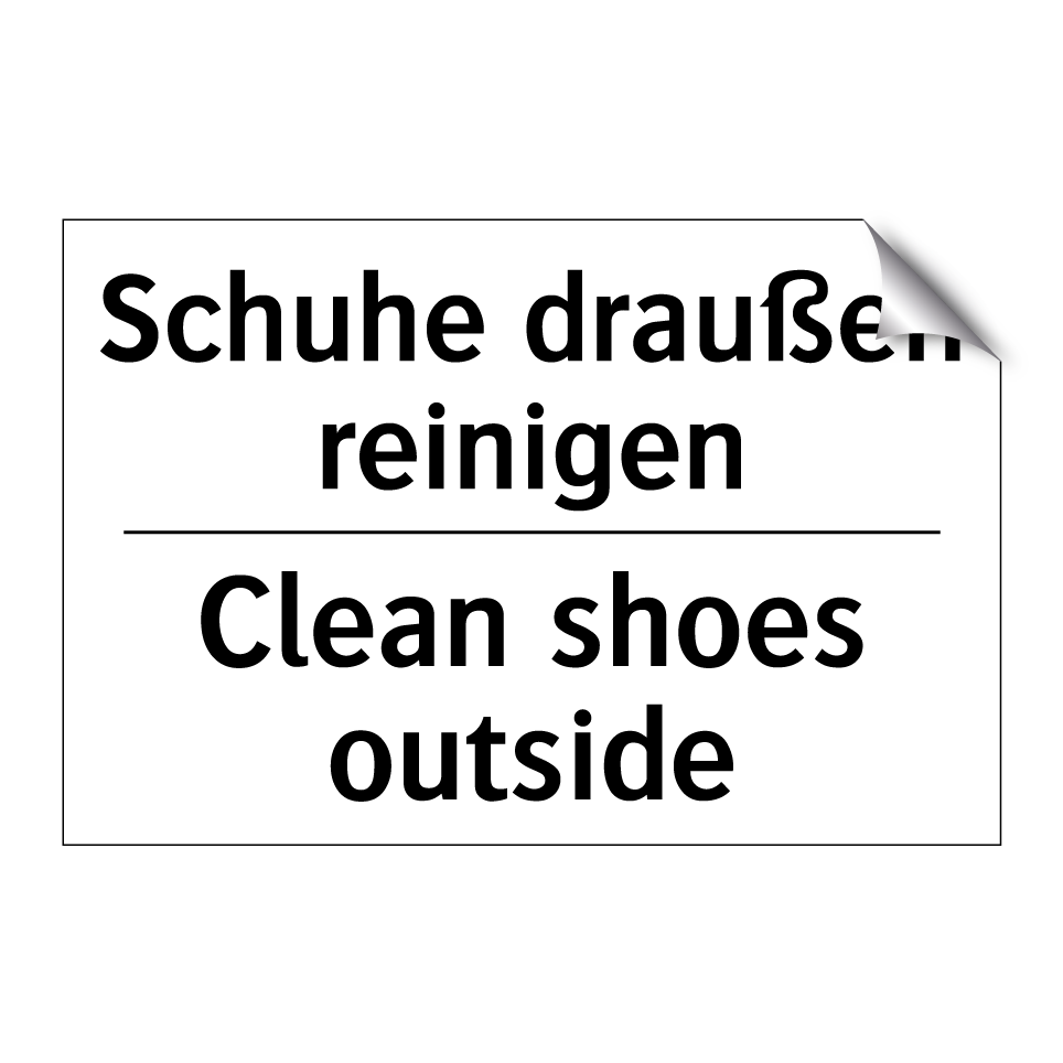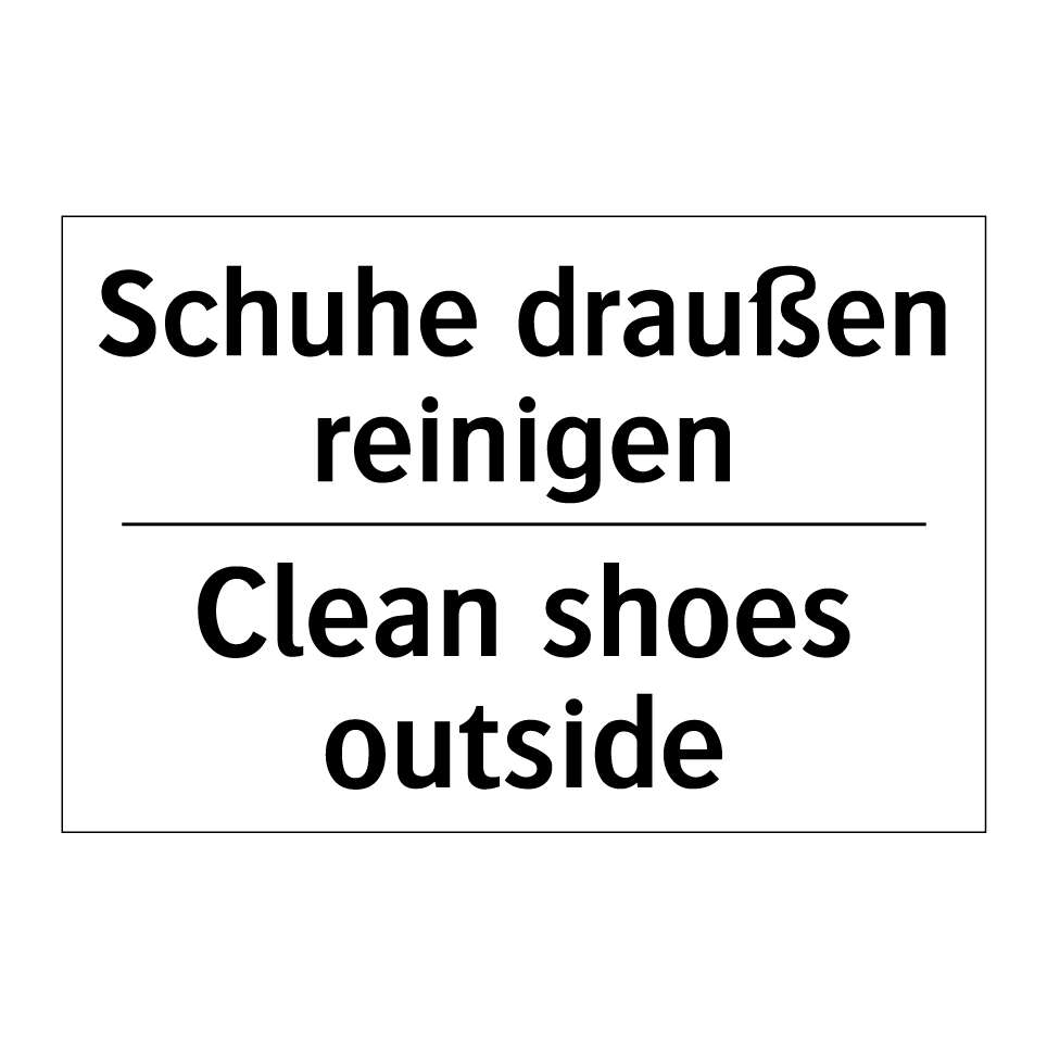 Zweisprachiges Verbotsschild mit deutschem Text Schuhe draußen reinigen und englischem Text Clean shoes outside