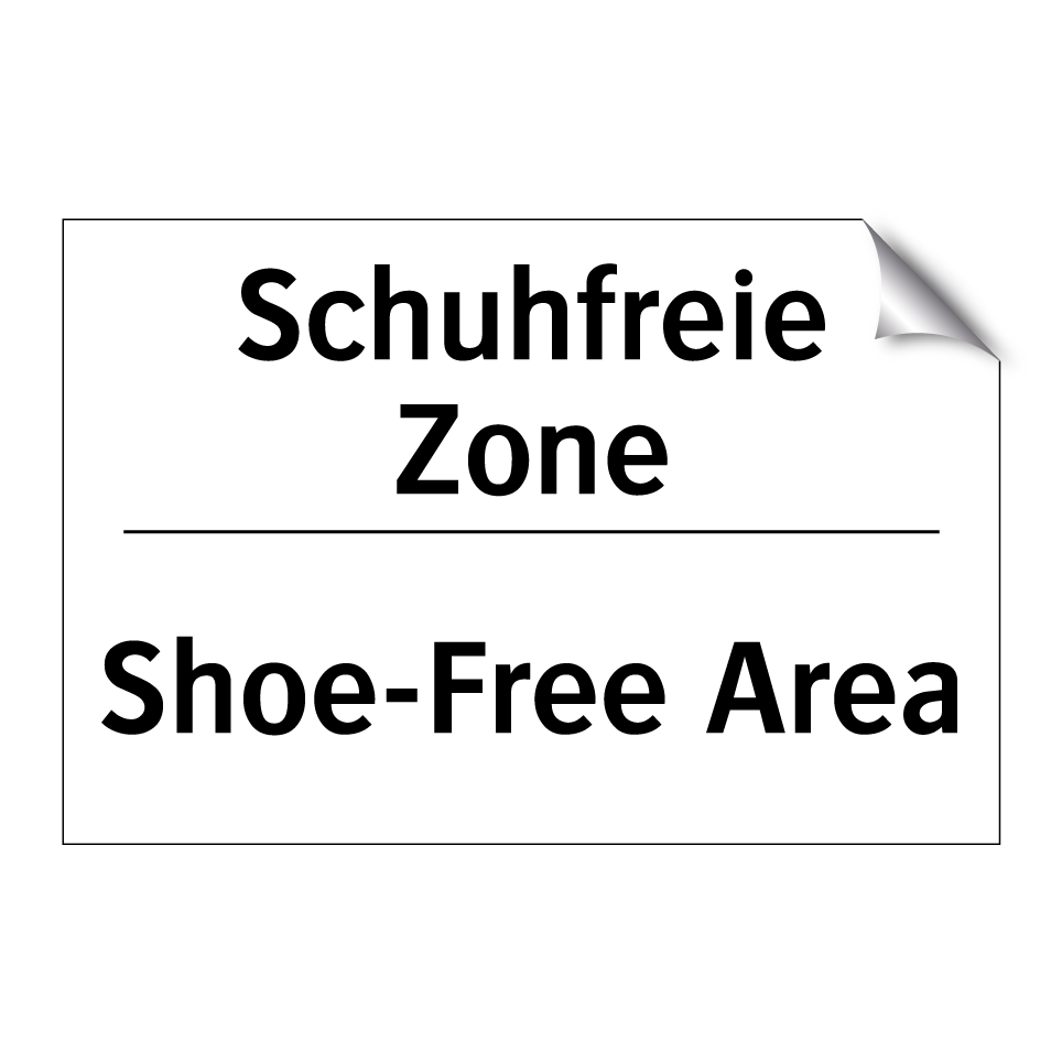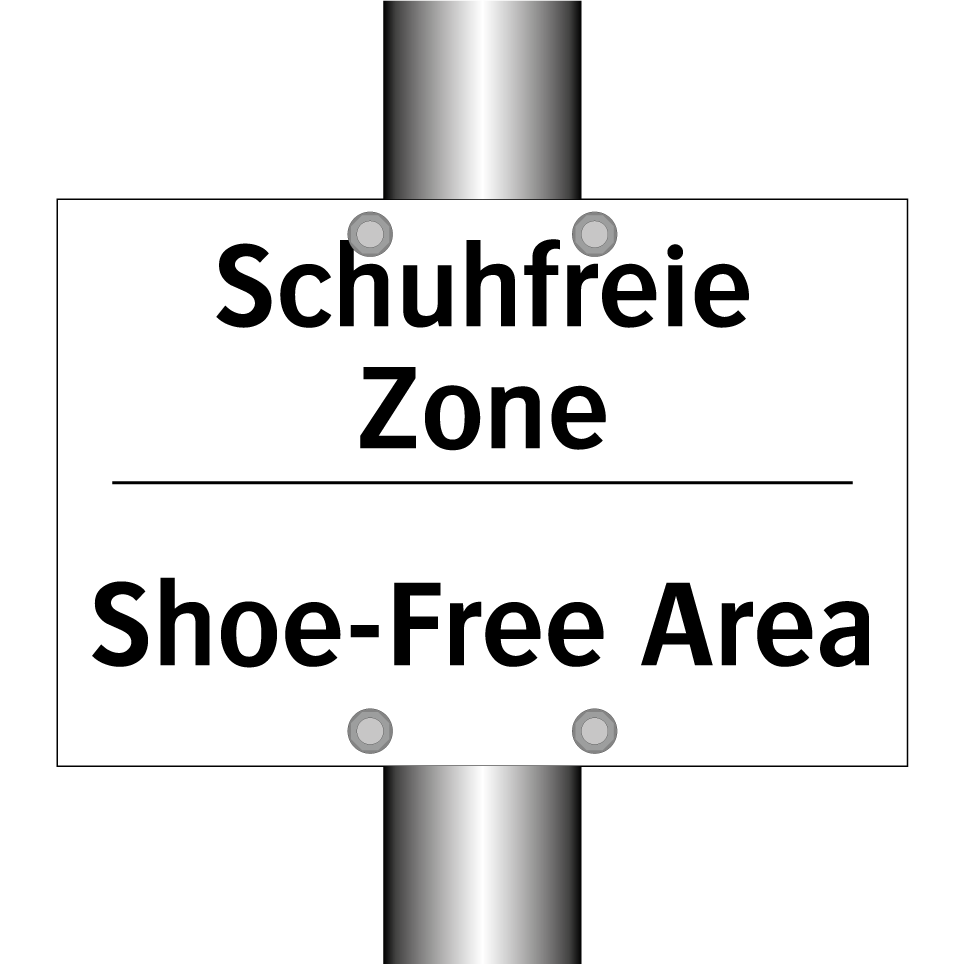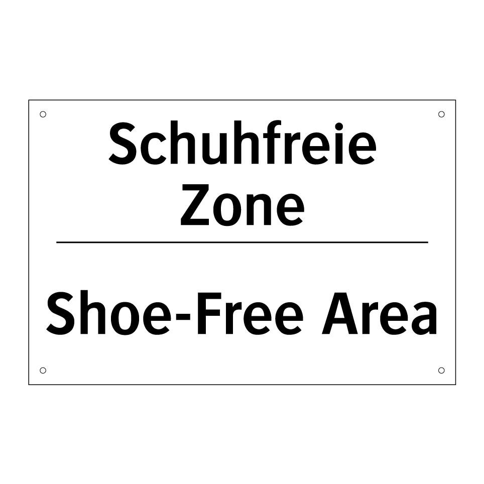 Zweisprachiges Verbotsschild mit deutschem Text Schuhfreie Zone und englischem Text Shoe-Free Area
