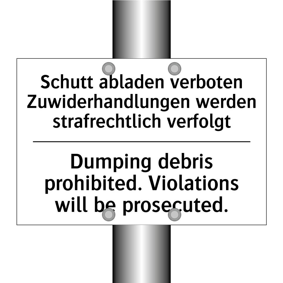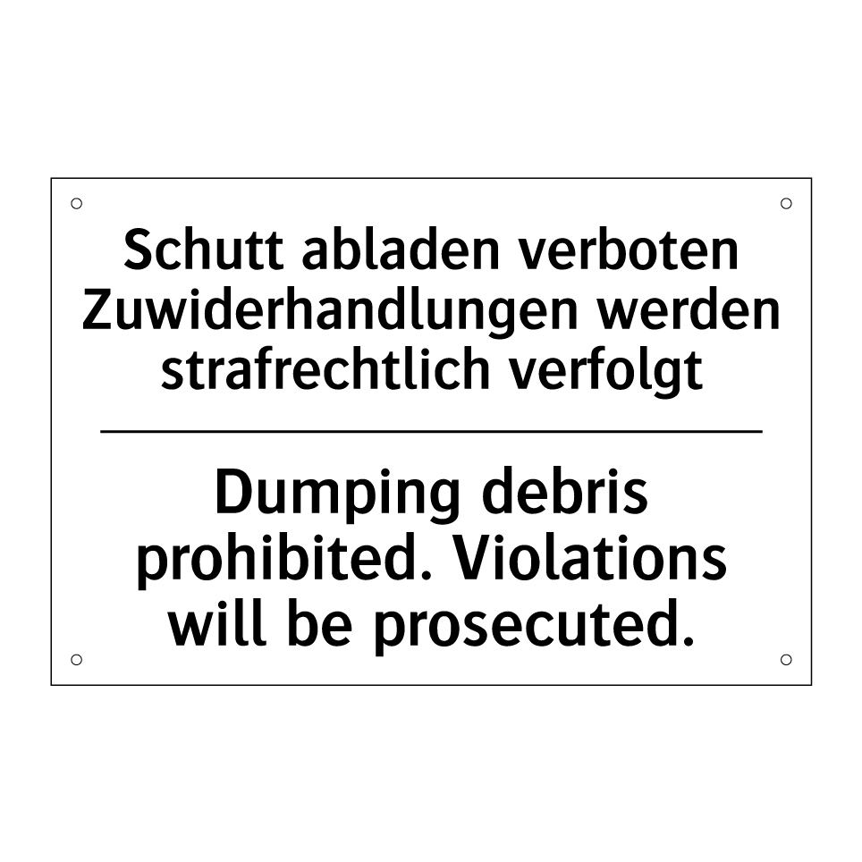 Zweisprachiges Verbotsschild mit deutschem Text Schutt abladen verboten Zuwiderhandlungen werden strafrechtlich verfolgt und englischem Text Dumping debris prohibited. Violations will be prosecuted.