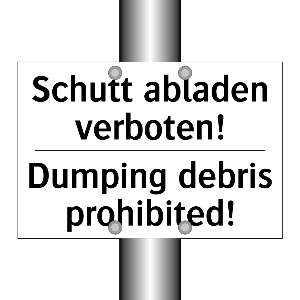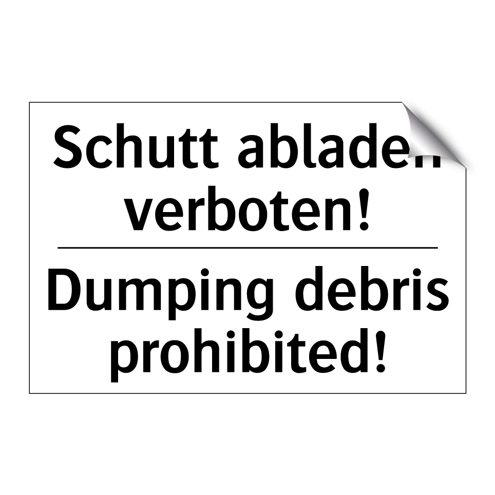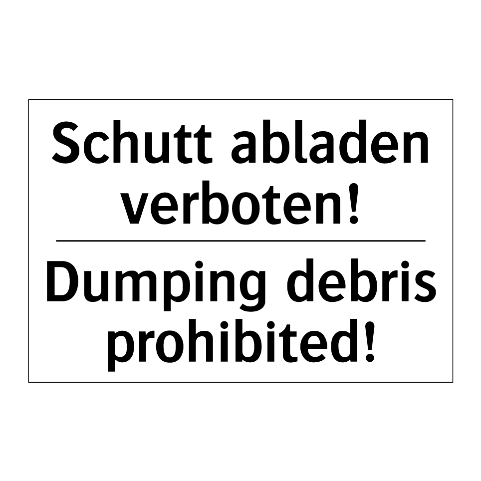 Zweisprachiges Verbotsschild mit deutschem Text Schutt abladen verboten! und englischem Text Dumping debris prohibited!