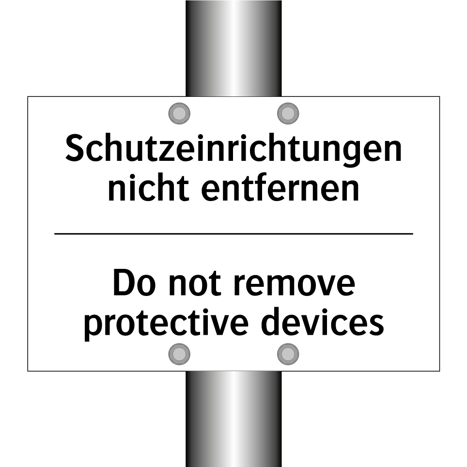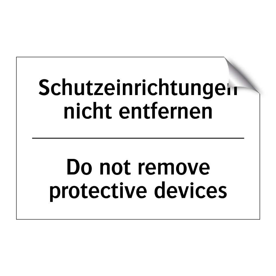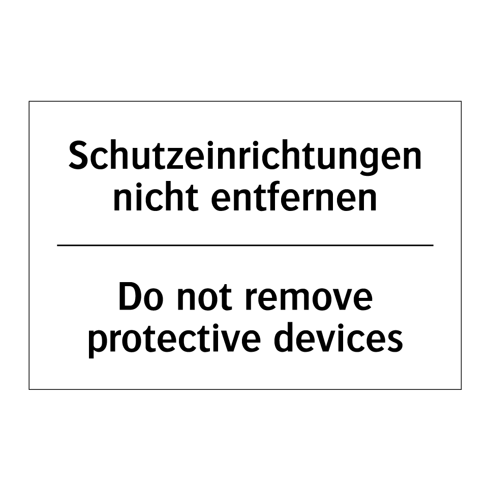Zweisprachiges Verbotsschild mit deutschem Text Schutzeinrichtungen nicht entfernen und englischem Text Do not remove protective devices
