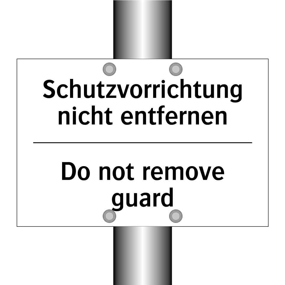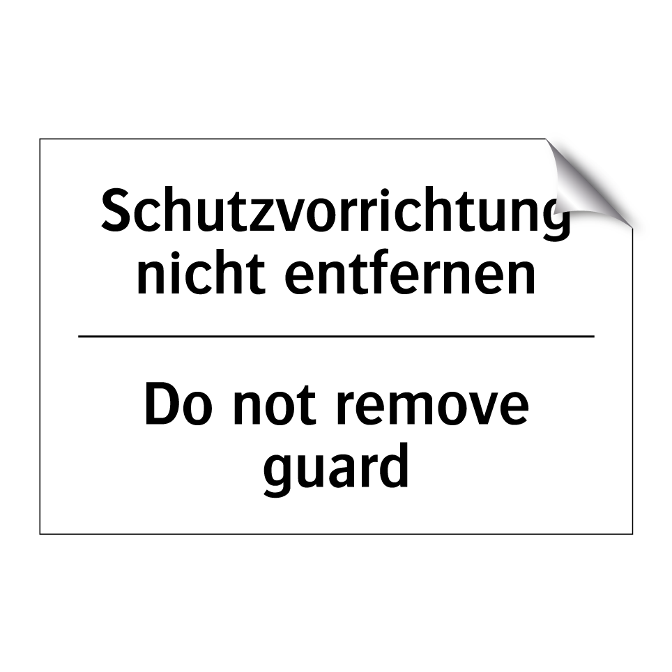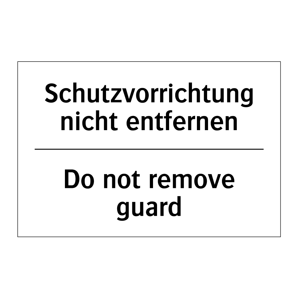 Zweisprachiges Verbotsschild mit deutschem Text Schutzvorrichtung nicht entfernen und englischem Text Do not remove guard