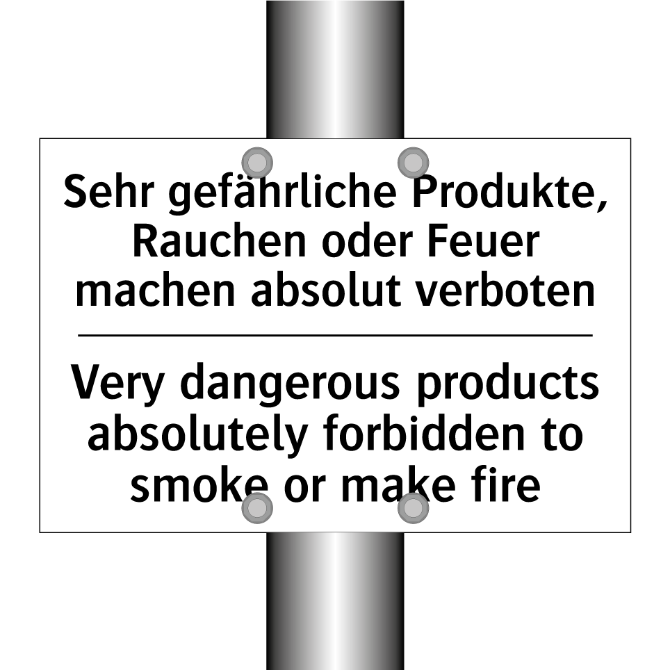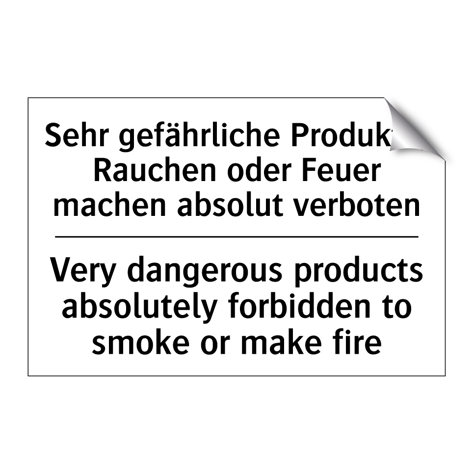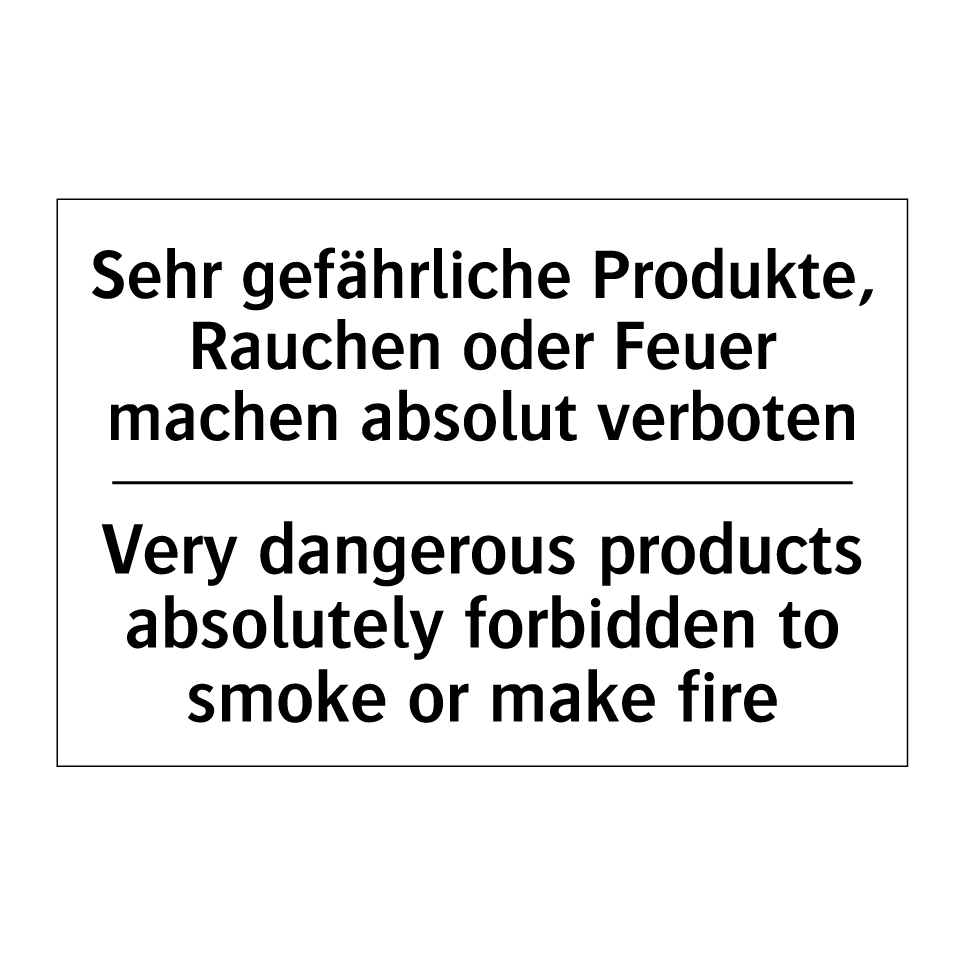Zweisprachiges Verbotsschild mit deutschem Text Sehr gefährliche Produkte, Rauchen oder Feuer machen absolut verboten und englischem Text Very dangerous products absolutely forbidden to smoke or make fire