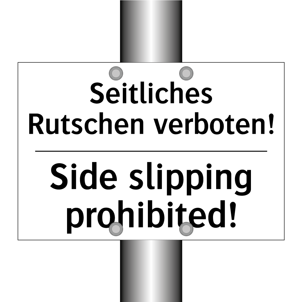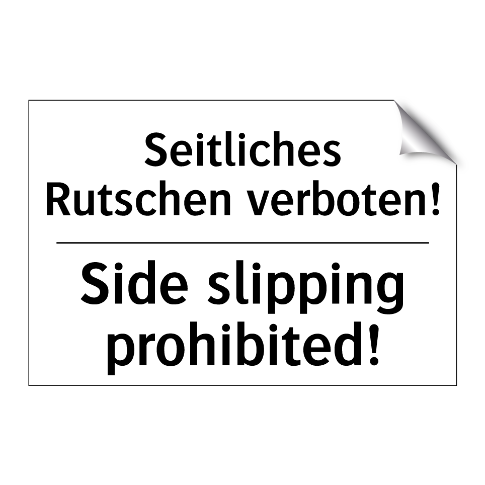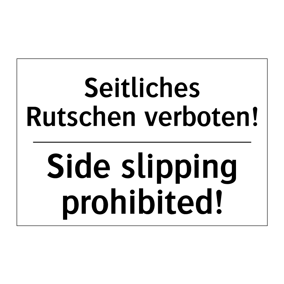 Zweisprachiges Verbotsschild mit deutschem Text Seitliches Rutschen verboten! und englischem Text Side slipping prohibited!