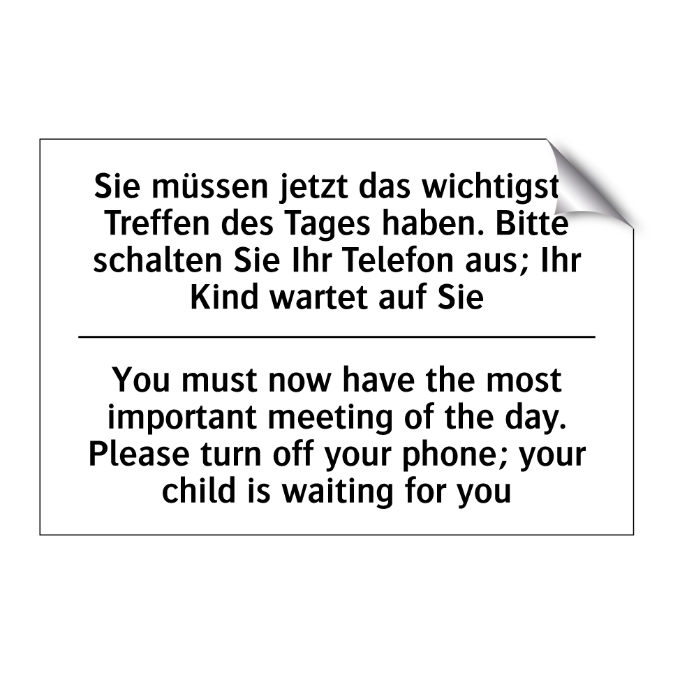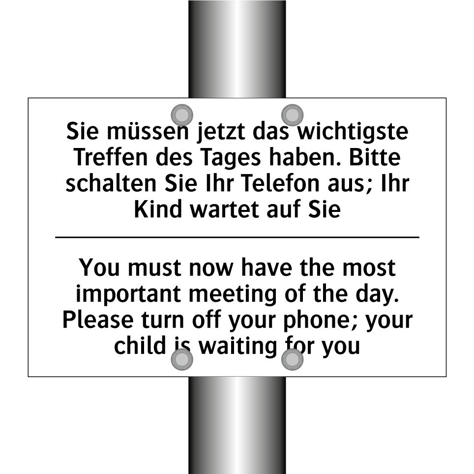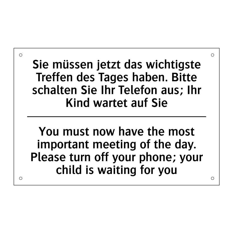 Zweisprachiges Verbotsschild mit deutschem Text Sie müssen jetzt das wichtigste Treffen des Tages haben. Bitte schalten Sie Ihr Telefon aus; Ihr Kind wartet auf Sie und englischem Text You must now have the most important meeting of the day. Please turn off your phone; your child is waiting for you