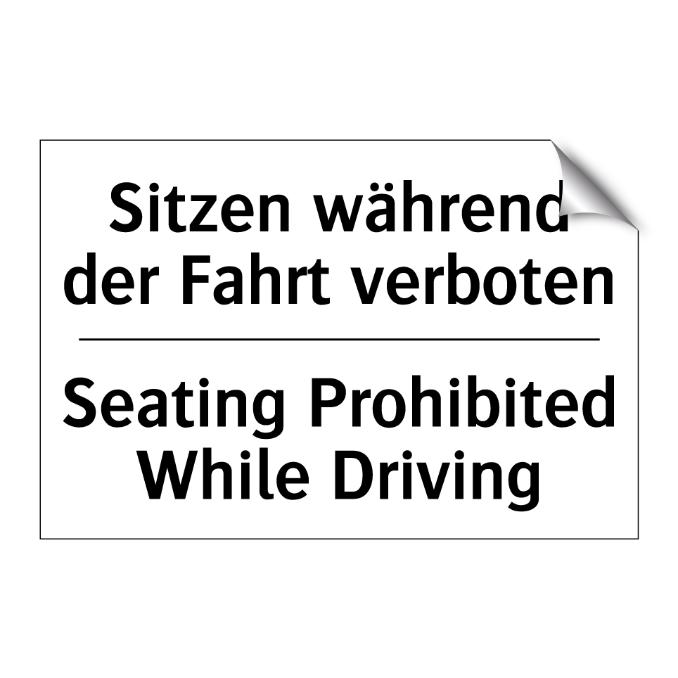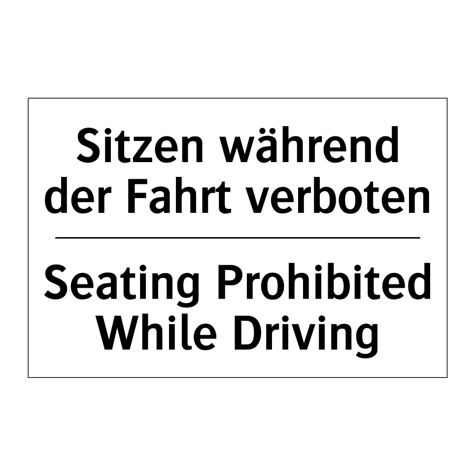Zweisprachiges Verbotsschild mit deutschem Text Sitzen während der Fahrt verboten und englischem Text Seating Prohibited While Driving