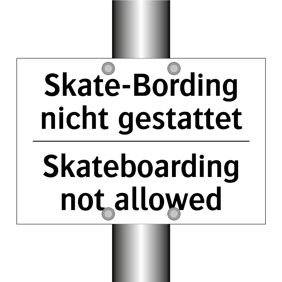 Diese Verbotsschild ist ideal, um unerwünschtes Skateboardfahren in bestimmten Bereichen zu verhindern. Mit ihrer klaren Botschaft in sowohl deutscher als auch englischer Sprache ist sie perfekt für internationale Umgebungen geeignet, in denen Besucher aus verschiedenen Ländern erwartet werden. Platzieren Sie diese zweisprachige Verbotsschilder an Orten wie Parks, Gehwegen, Einkaufszentren oder anderen öffentlichen Bereichen, wo das Skateboarden eingeschränkt werden soll. Die deutliche und leicht verständliche Beschriftung sorgt dafür, dass die Regeln von allen beachtet werden. Diese Schilder sind ein effektives Mittel, um die Sicherheit und Ordnung in Ihrem Umfeld zu gewährleisten.