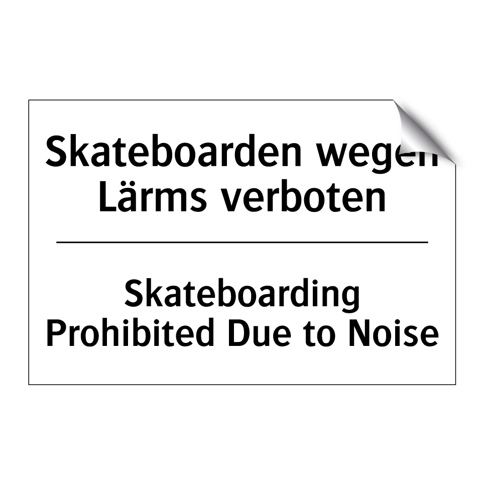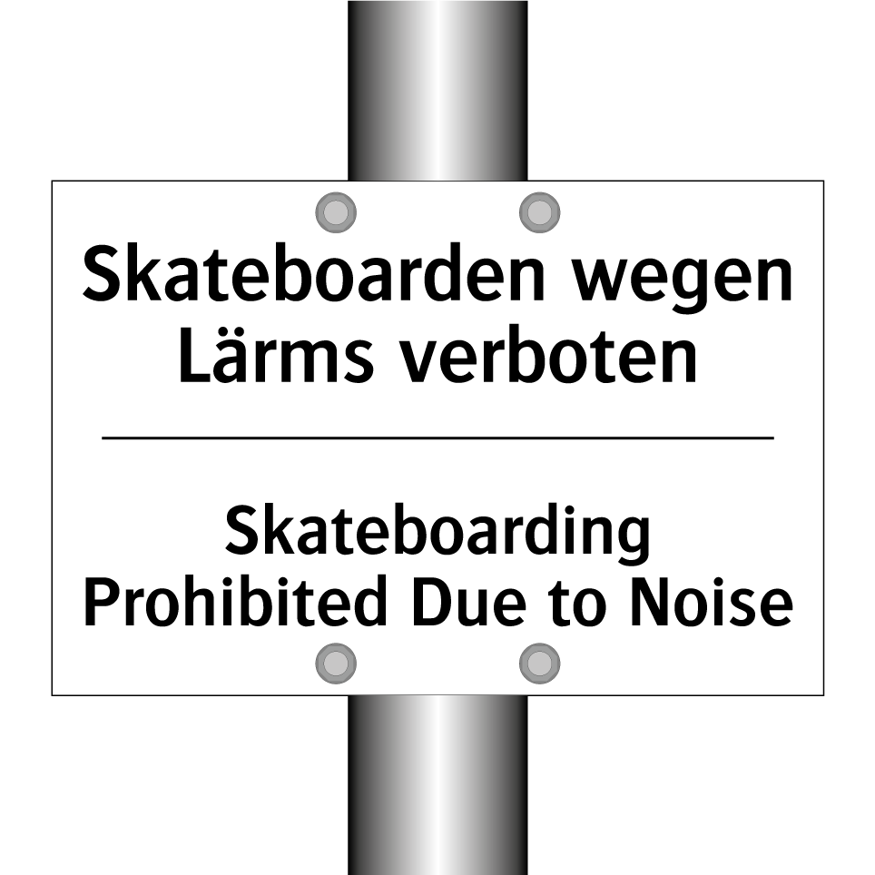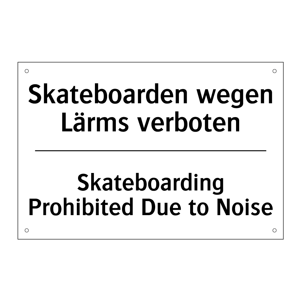 Zweisprachiges Verbotsschild mit deutschem Text Skateboarden wegen Lärms verboten und englischem Text Skateboarding Prohibited Due to Noise