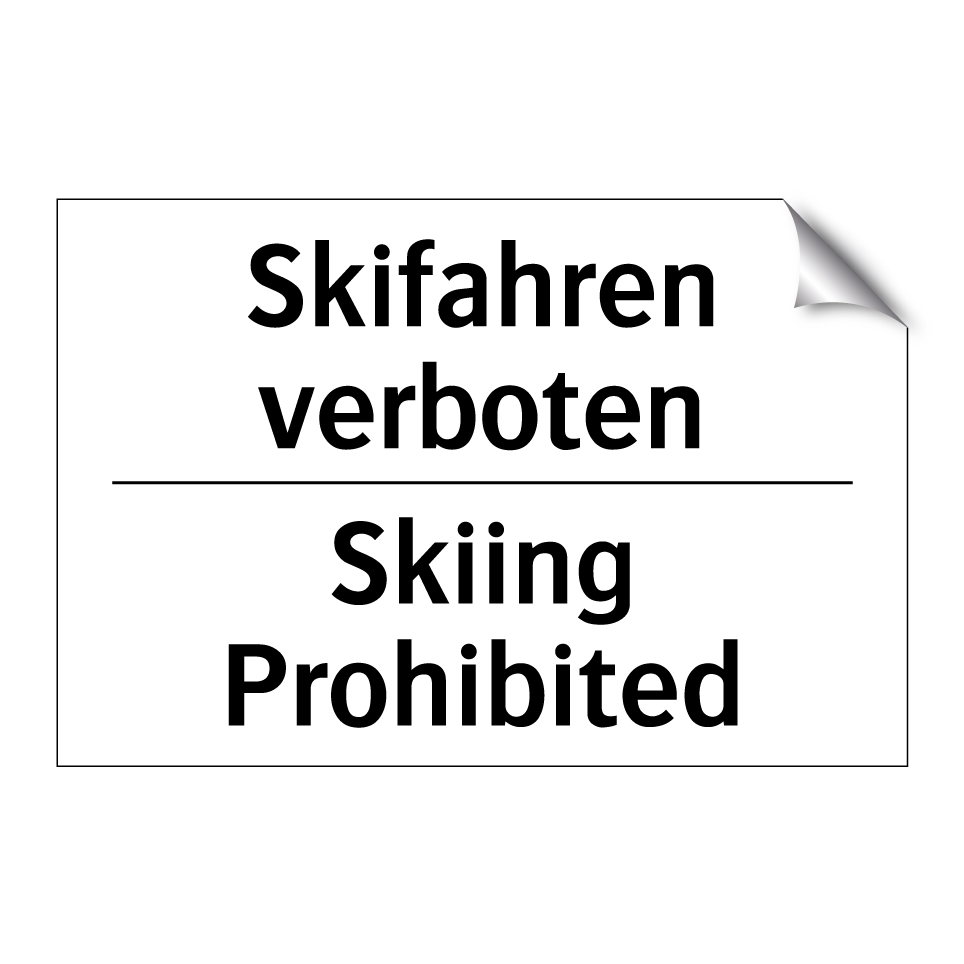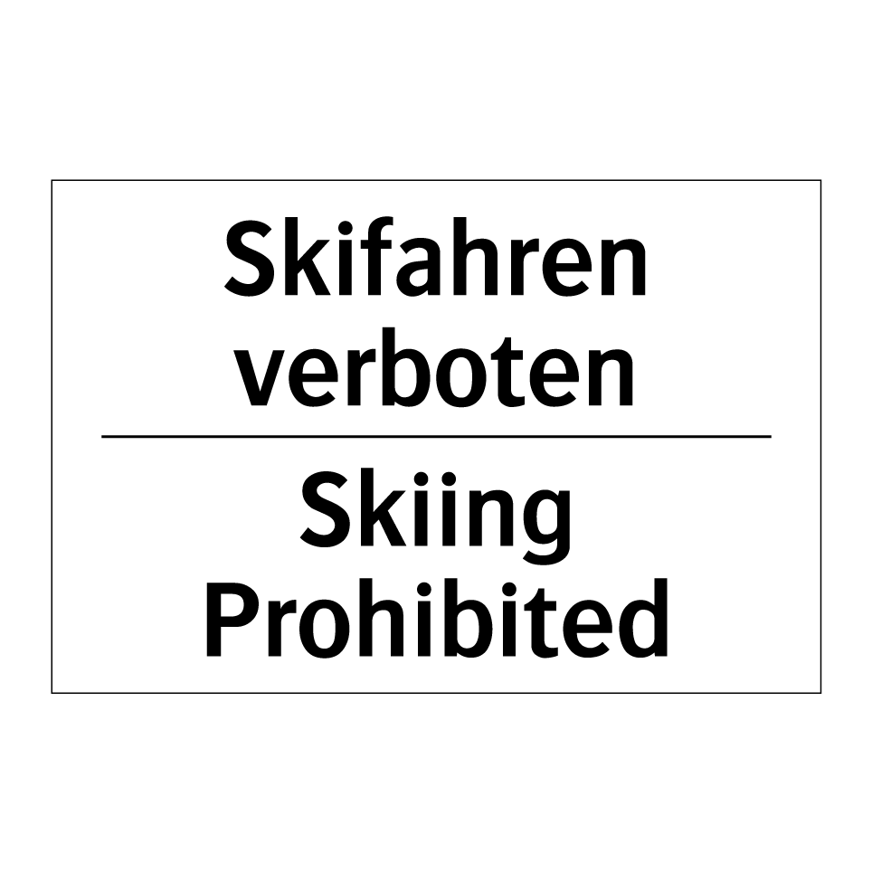 Zweisprachiges Verbotsschild mit deutschem Text Skifahren verboten und englischem Text Skiing Prohibited