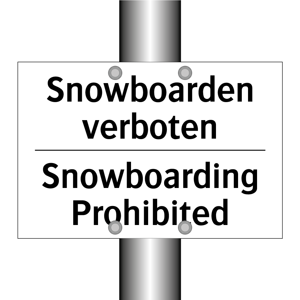 Zweisprachiges Verbotsschild mit deutschem Text Snowboarden verboten und englischem Text Snowboarding Prohibited