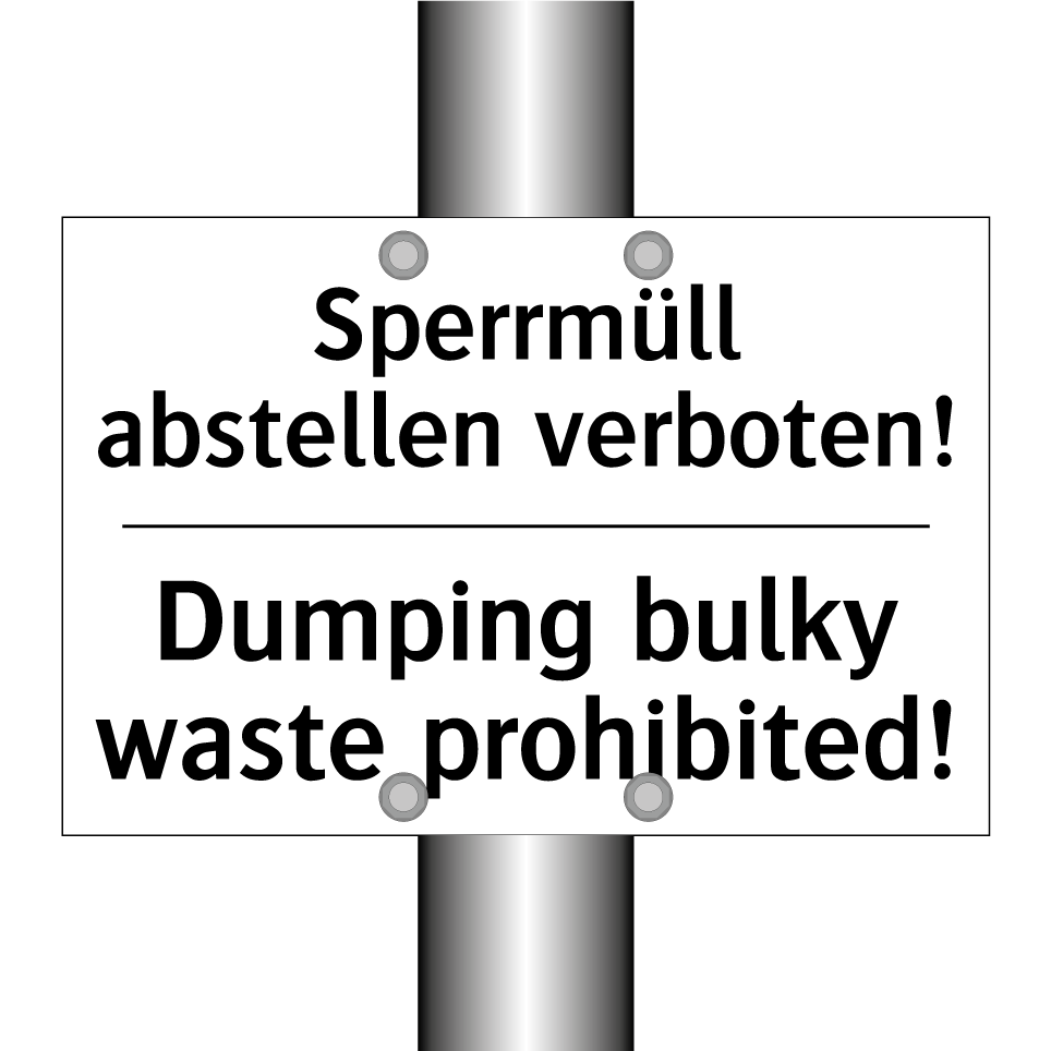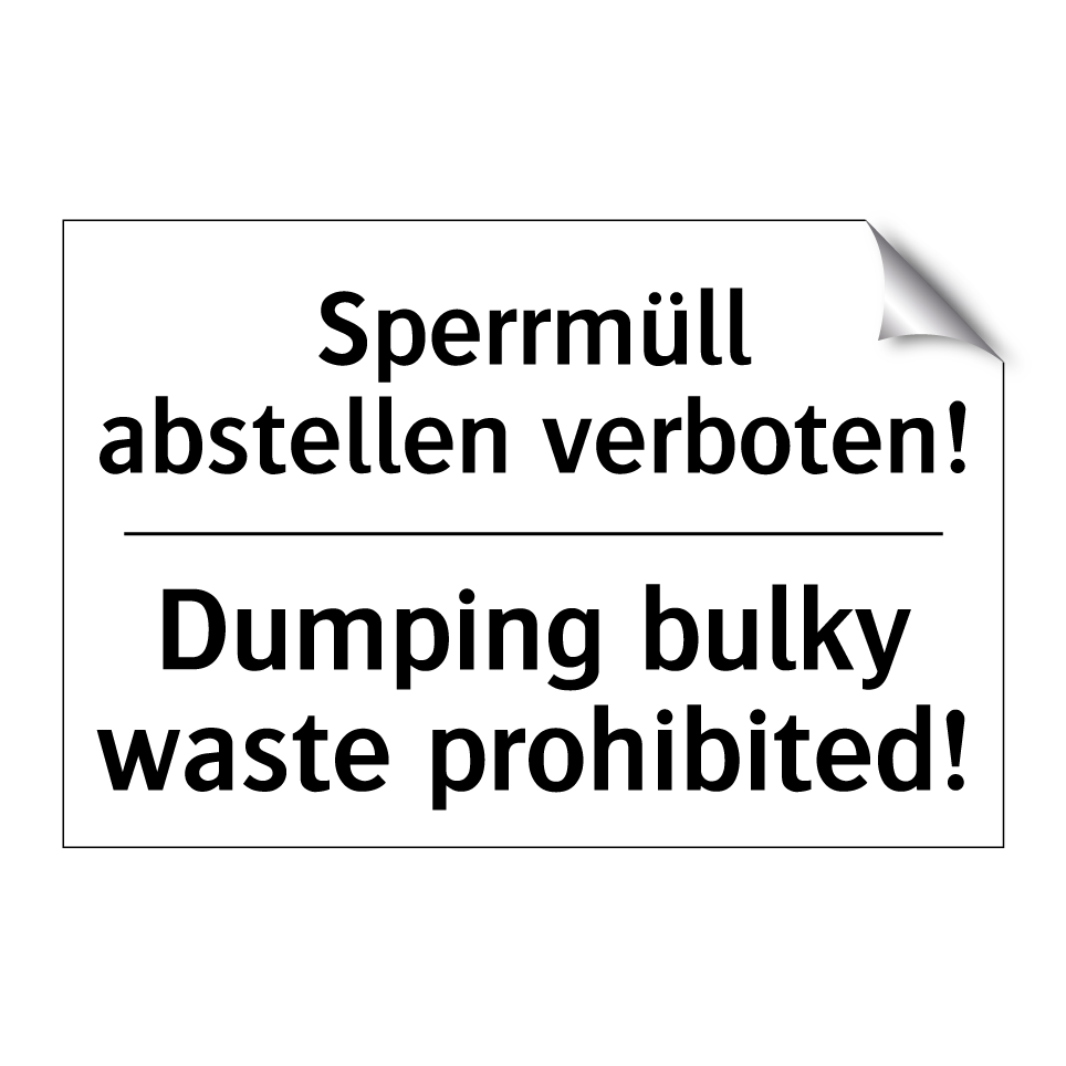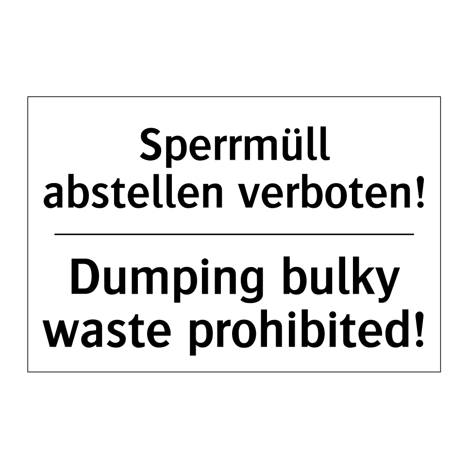 Zweisprachiges Verbotsschild mit deutschem Text Sperrmüll abstellen verboten! und englischem Text Dumping bulky waste prohibited!