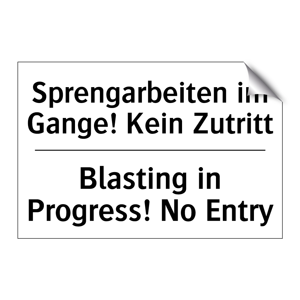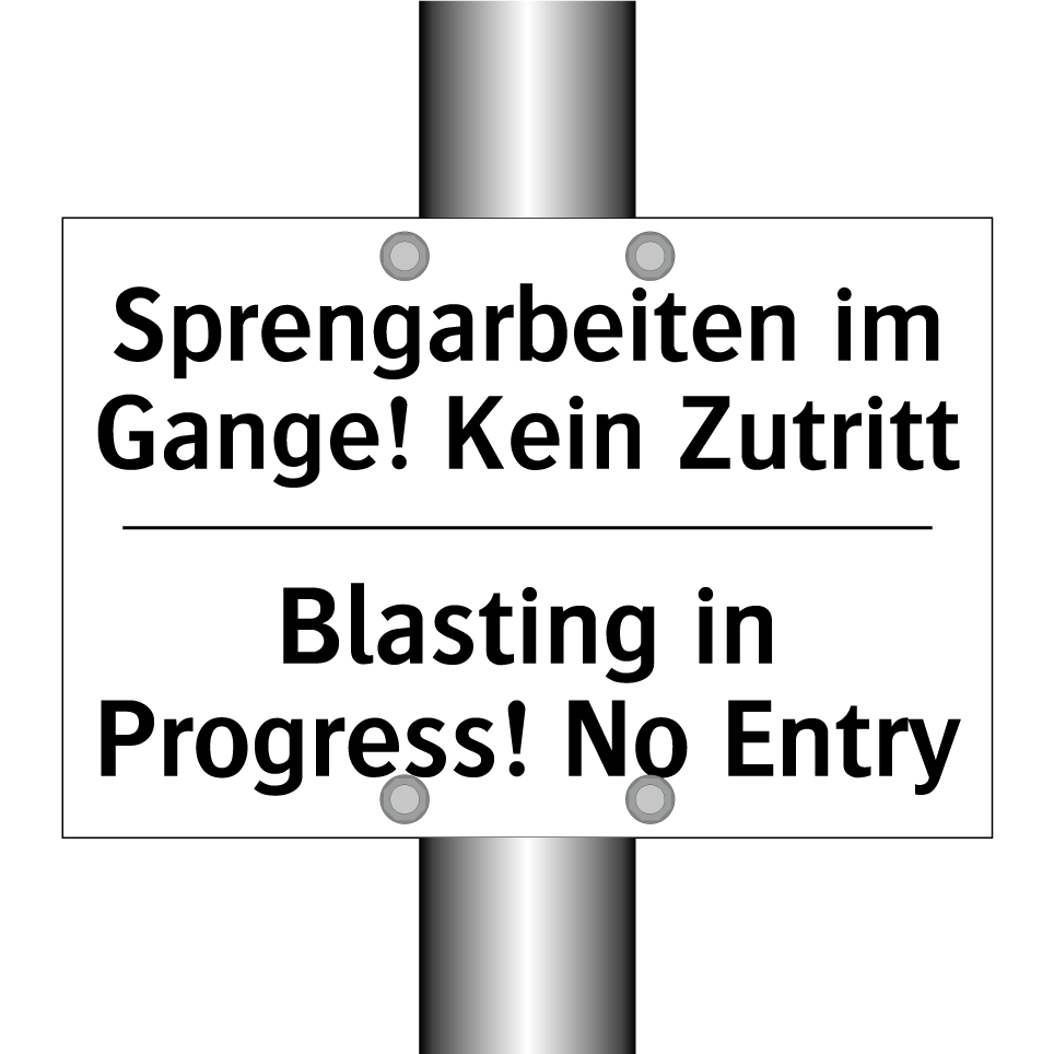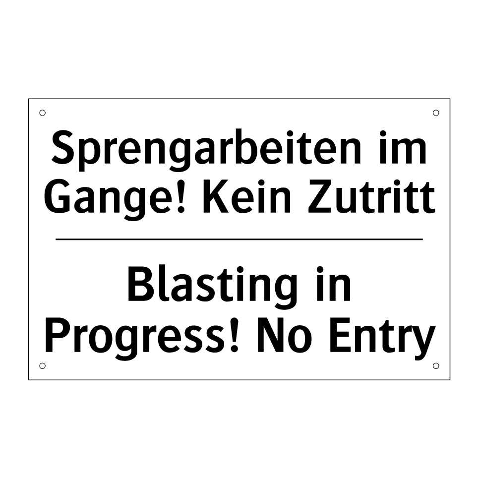 Zweisprachiges Verbotsschild mit deutschem Text Sprengarbeiten im Gange! Kein Zutritt und englischem Text Blasting in Progress! No Entry