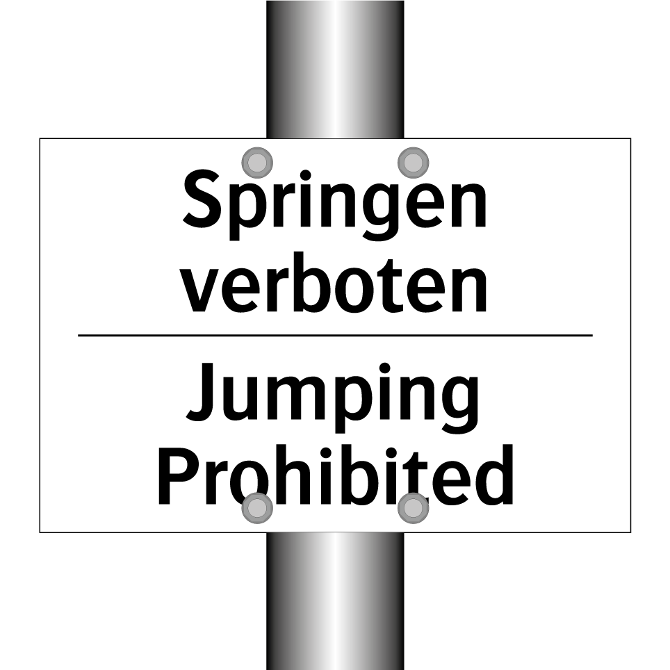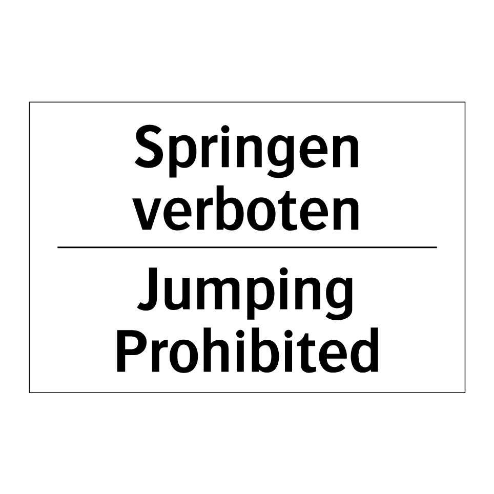 Zweisprachiges Verbotsschild mit deutschem Text Springen verboten und englischem Text Jumping Prohibited