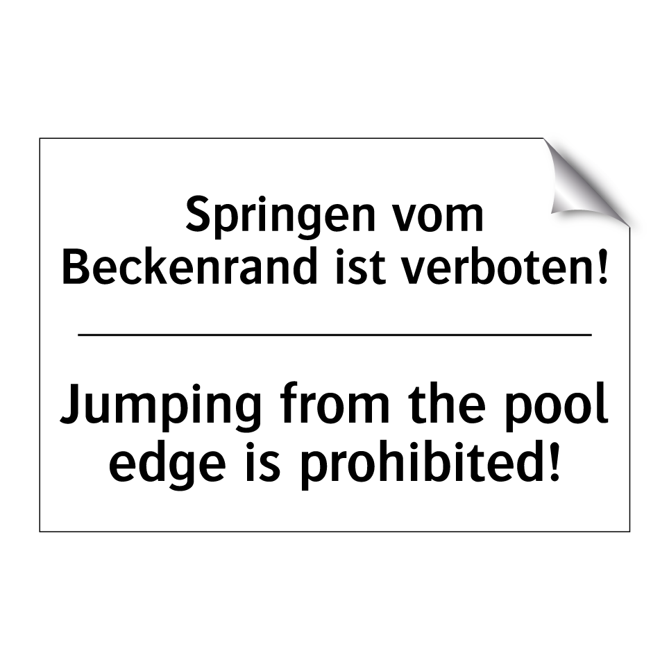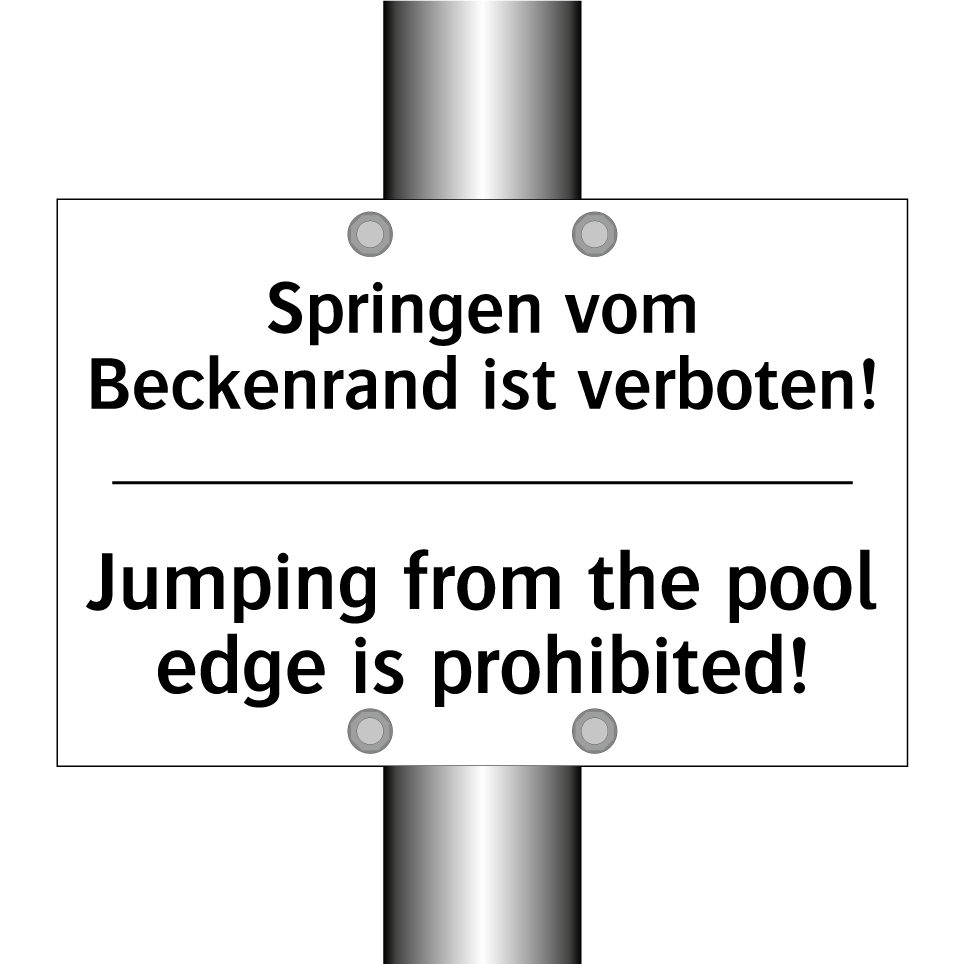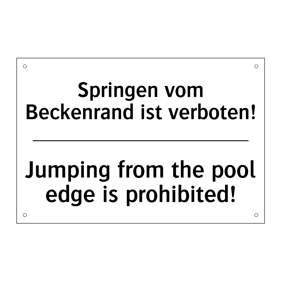 Zweisprachiges Verbotsschild mit deutschem Text Springen vom Beckenrand ist verboten! und englischem Text Jumping from the pool edge is prohibited!