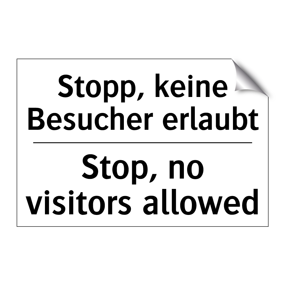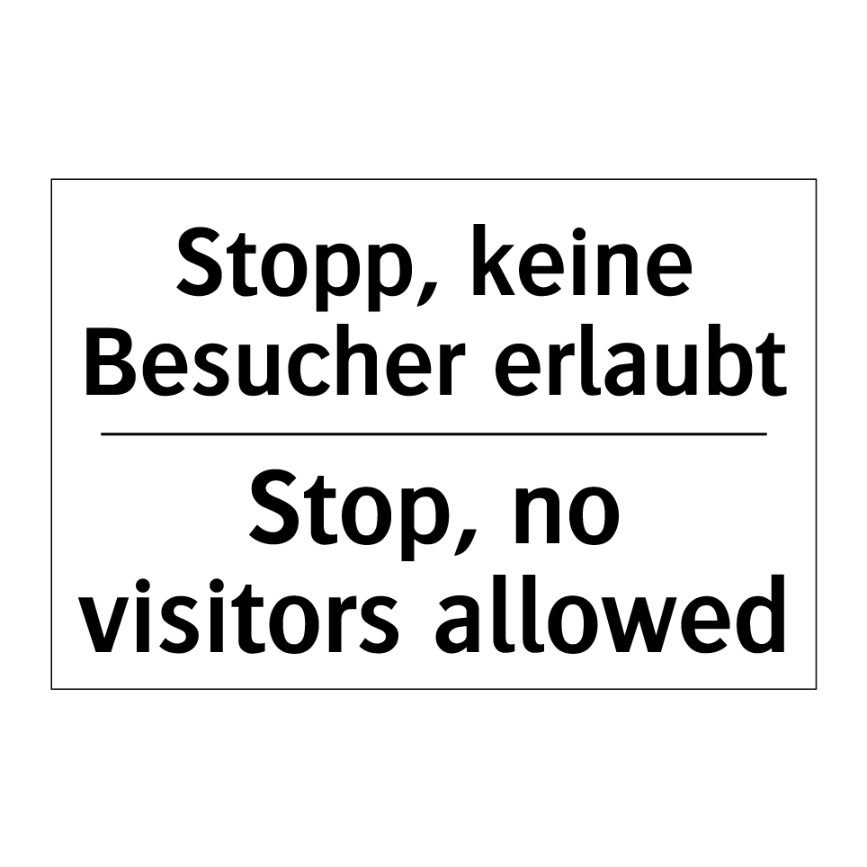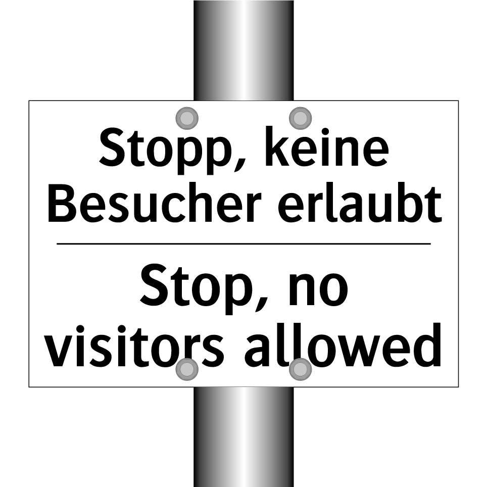 Zweisprachiges Verbotsschild mit deutschem Text Stopp, keine Besucher erlaubt und englischem Text Stop, no visitors allowed