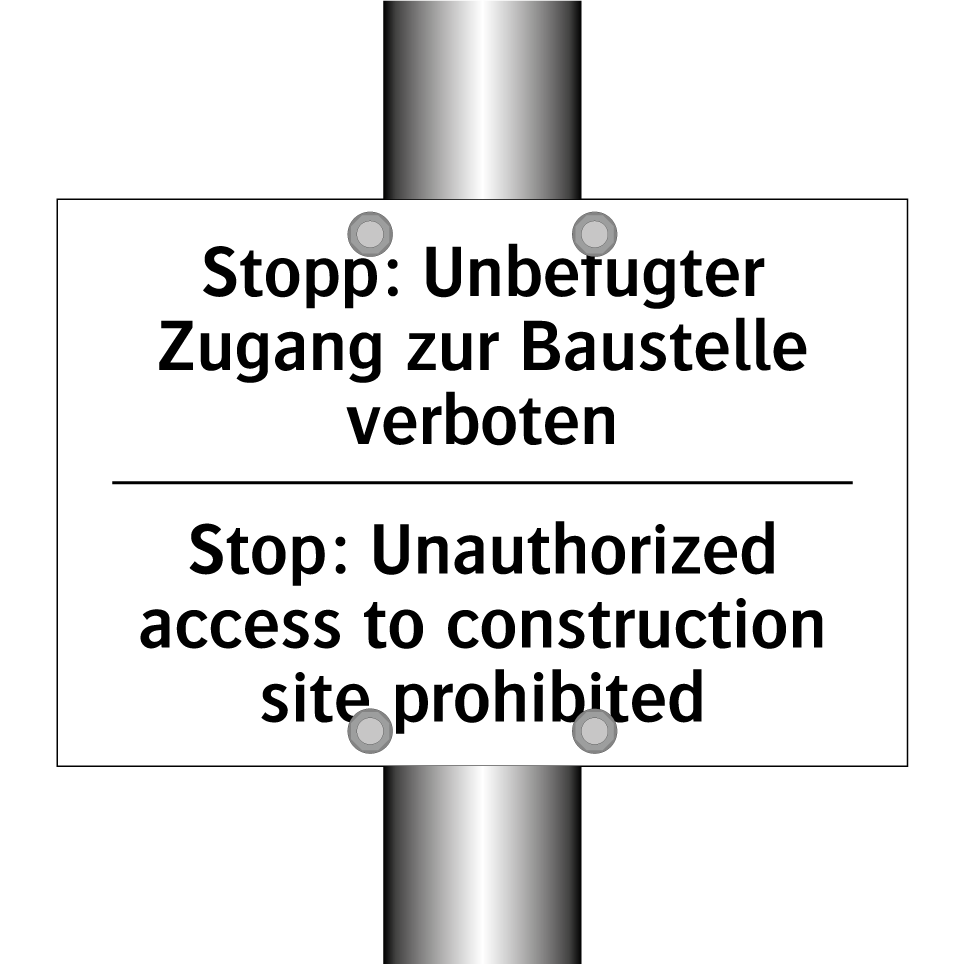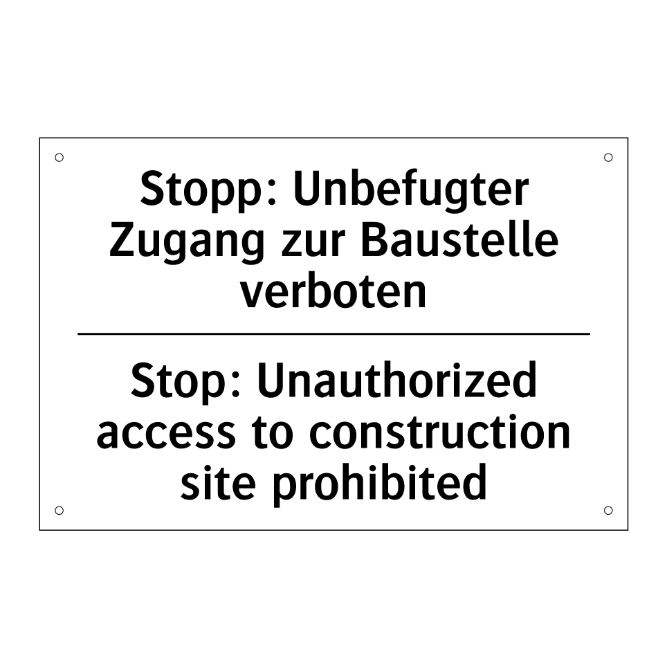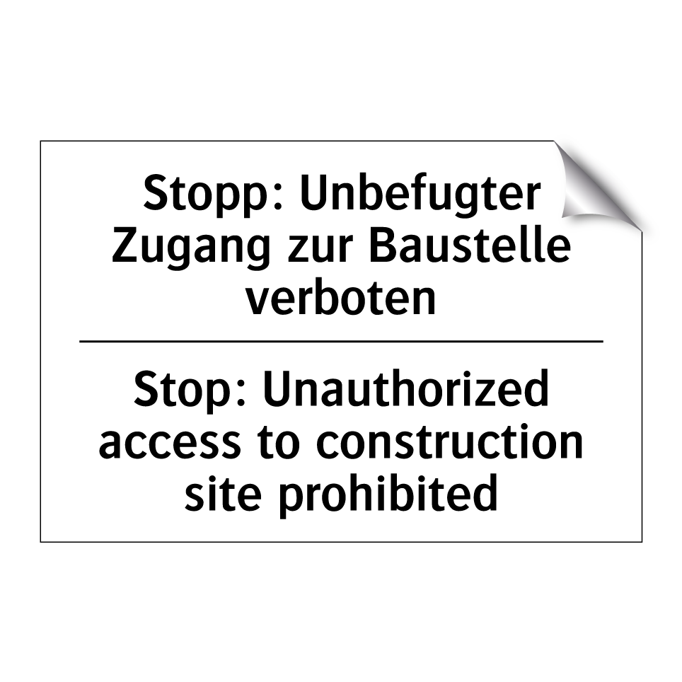 Zweisprachiges Verbotsschild mit deutschem Text Stopp: Unbefugter Zugang zur Baustelle verboten und englischem Text Stop: Unauthorized access to construction site prohibited