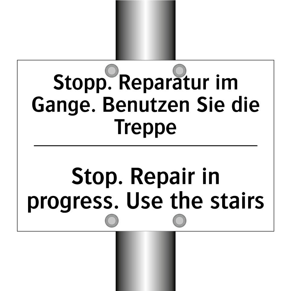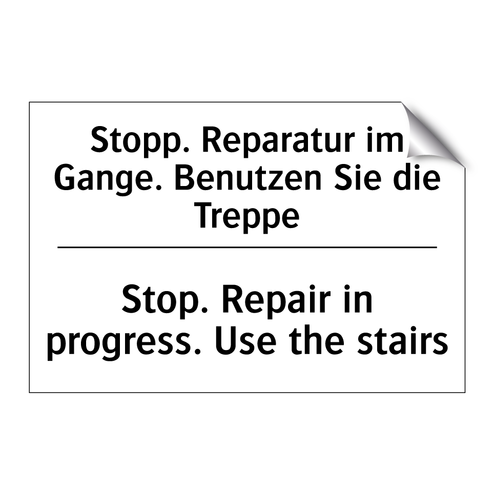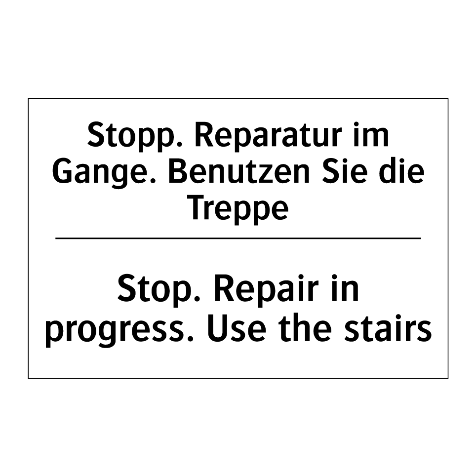 Zweisprachiges Verbotsschild mit deutschem Text Stopp. Reparatur im Gange. Benutzen Sie die Treppe und englischem Text Stop. Repair in progress. Use the stairs