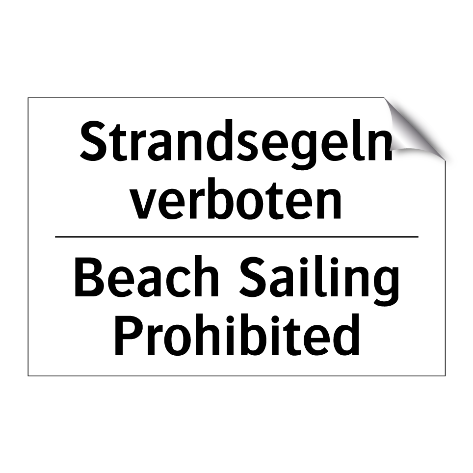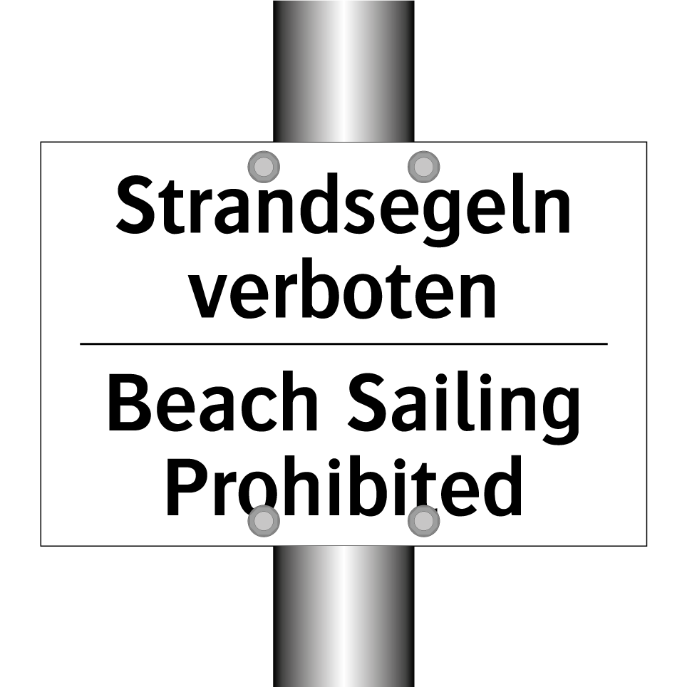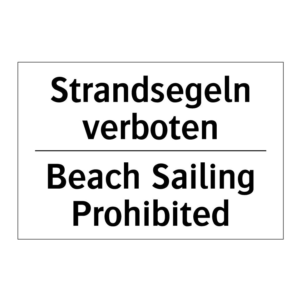 Zweisprachiges Verbotsschild mit deutschem Text Strandsegeln verboten und englischem Text Beach Sailing Prohibited
