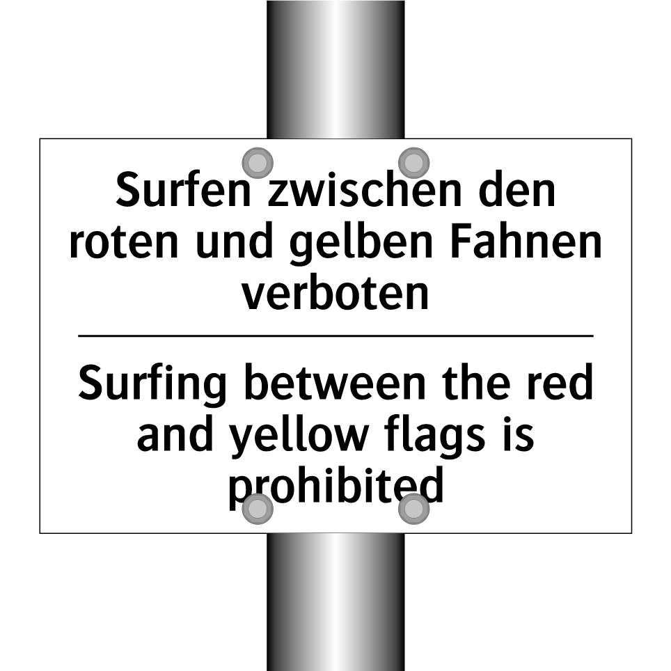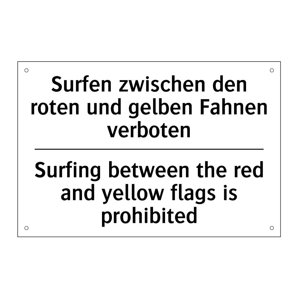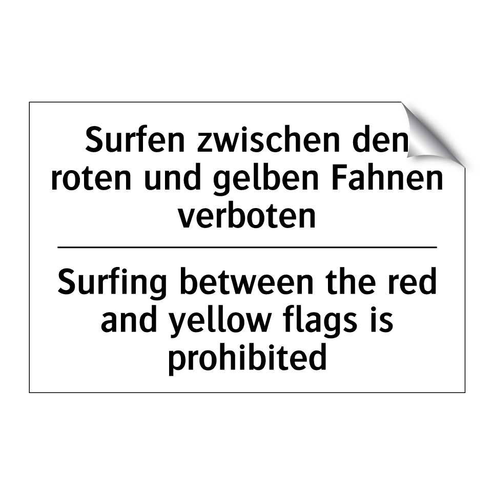 Zweisprachiges Verbotsschild mit deutschem Text Surfen zwischen den roten und gelben Fahnen verboten und englischem Text Surfing between the red and yellow flags is prohibited