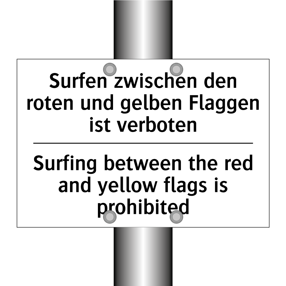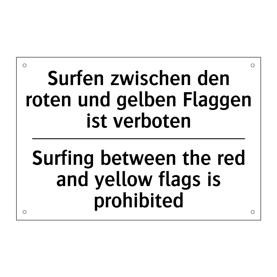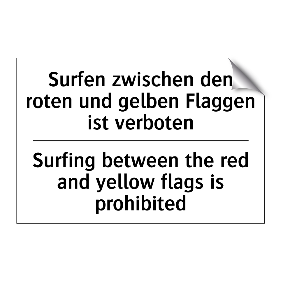 Zweisprachiges Verbotsschild mit deutschem Text Surfen zwischen den roten und gelben Flaggen ist verboten und englischem Text Surfing between the red and yellow flags is prohibited