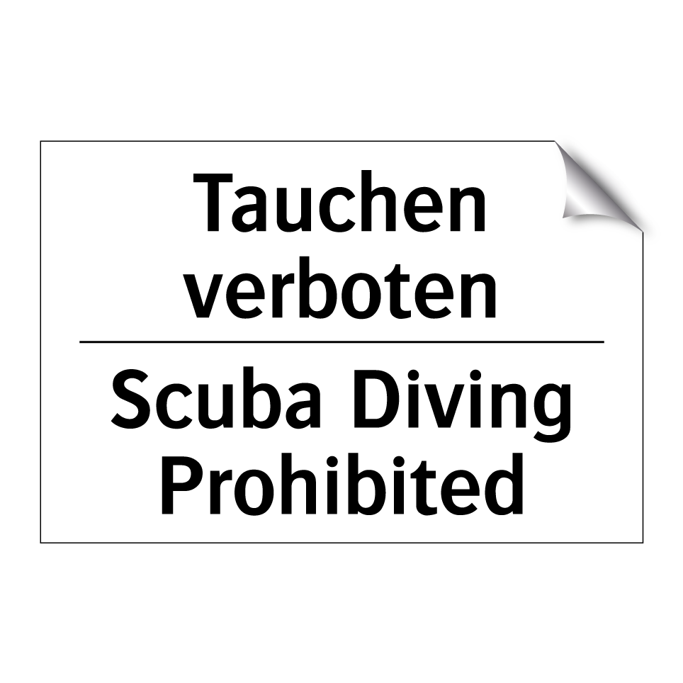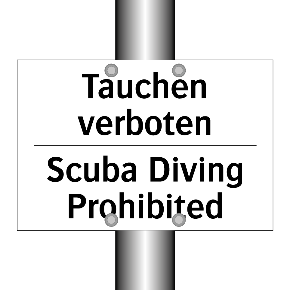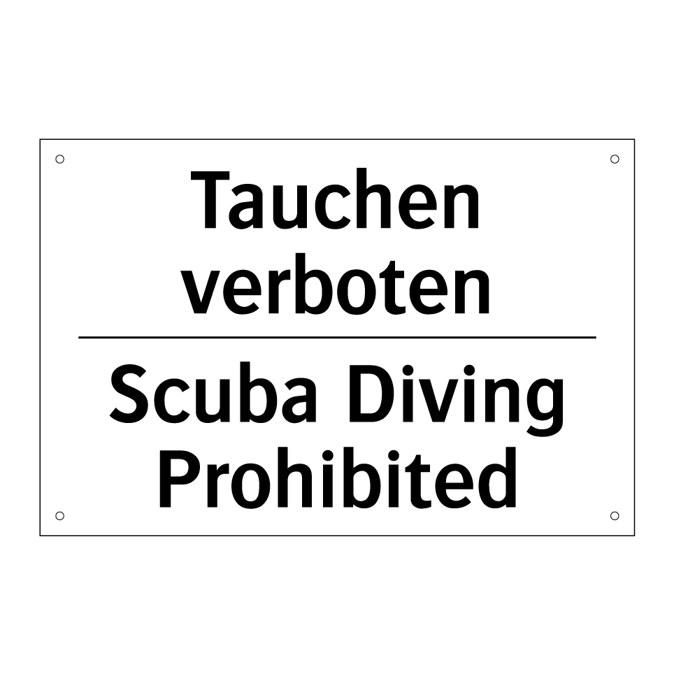 Zweisprachiges Verbotsschild mit deutschem Text Tauchen verboten und englischem Text Scuba Diving Prohibited