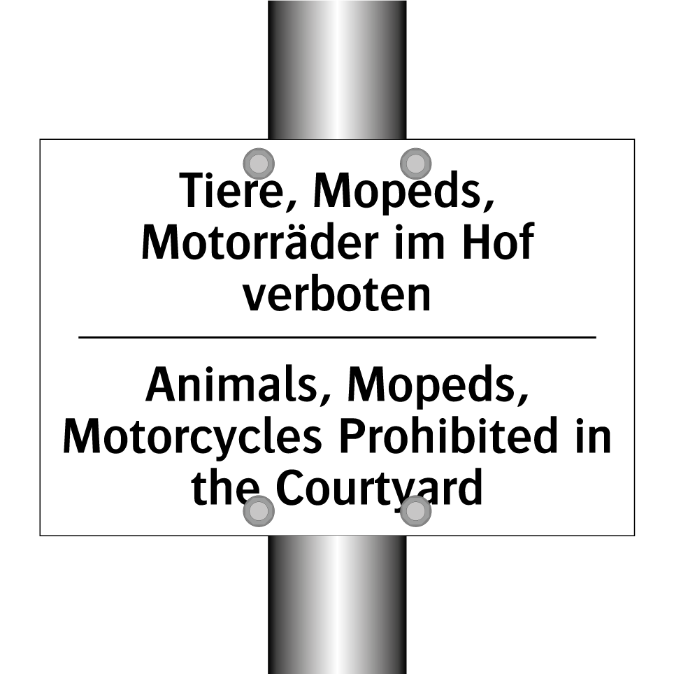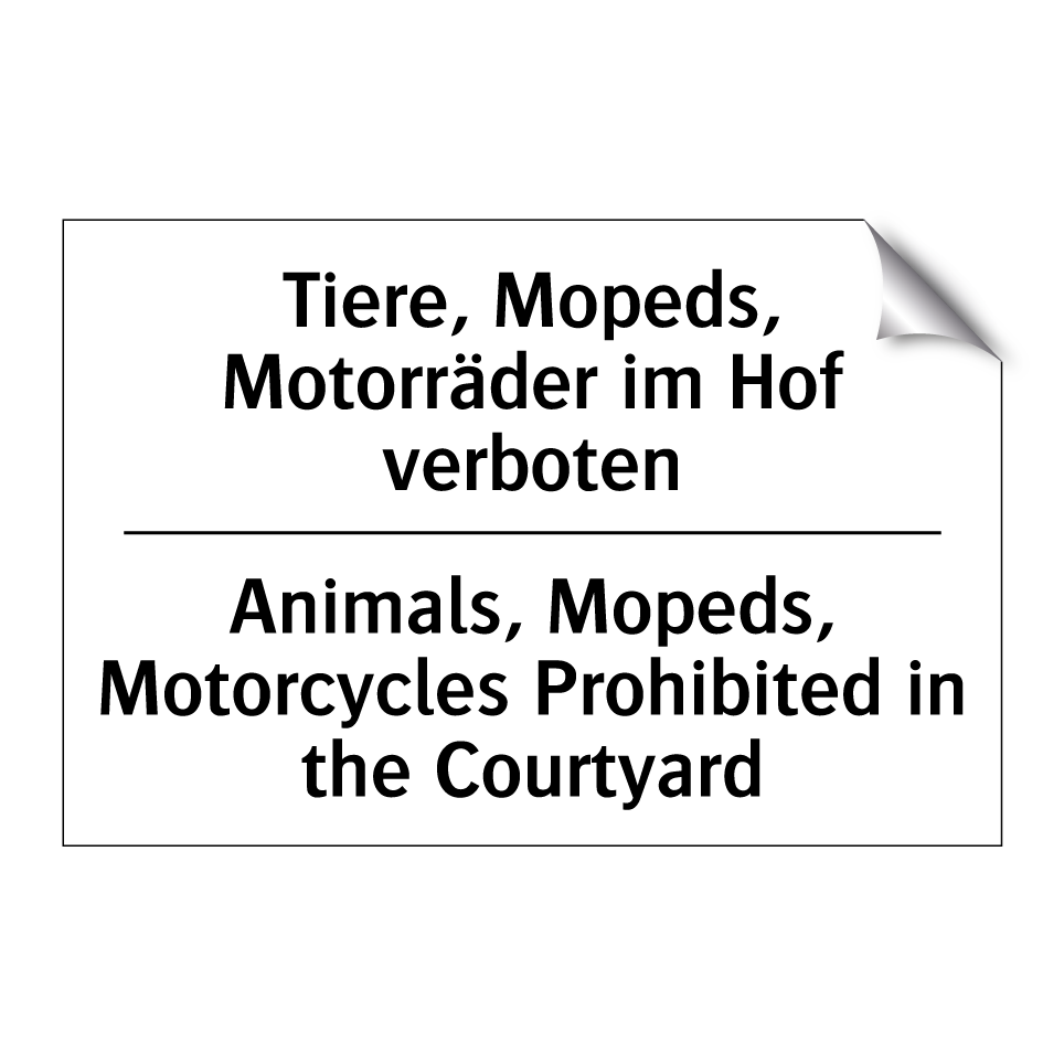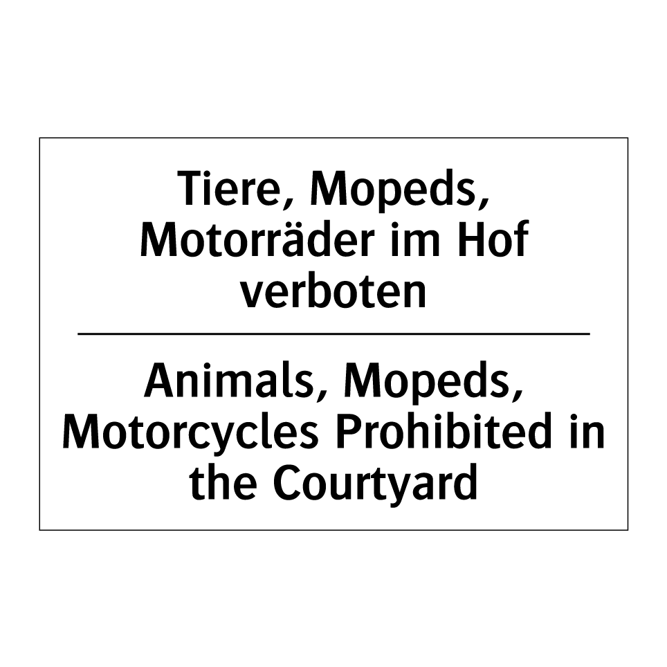 Zweisprachiges Verbotsschild mit deutschem Text Tiere, Mopeds, Motorräder im Hof verboten und englischem Text Animals, Mopeds, Motorcycles Prohibited in the Courtyard