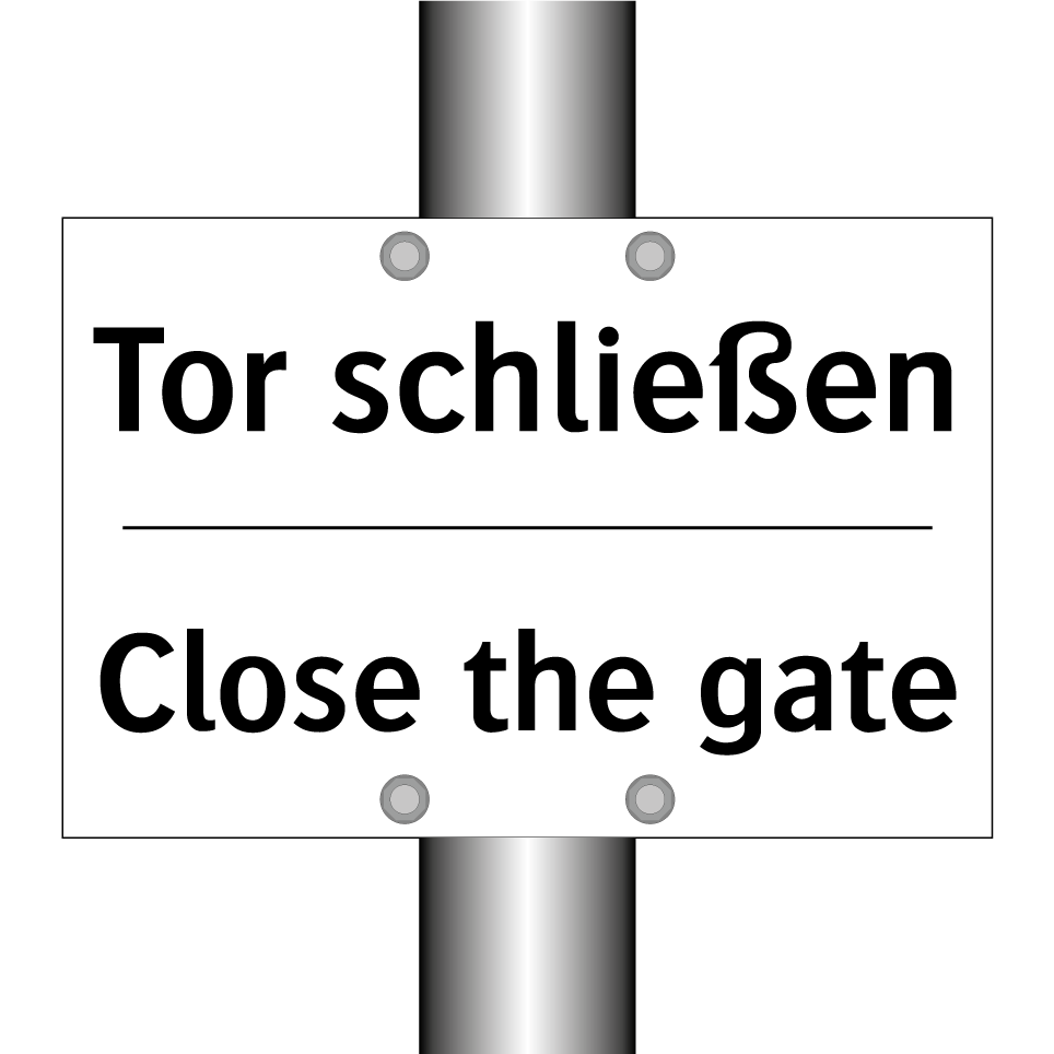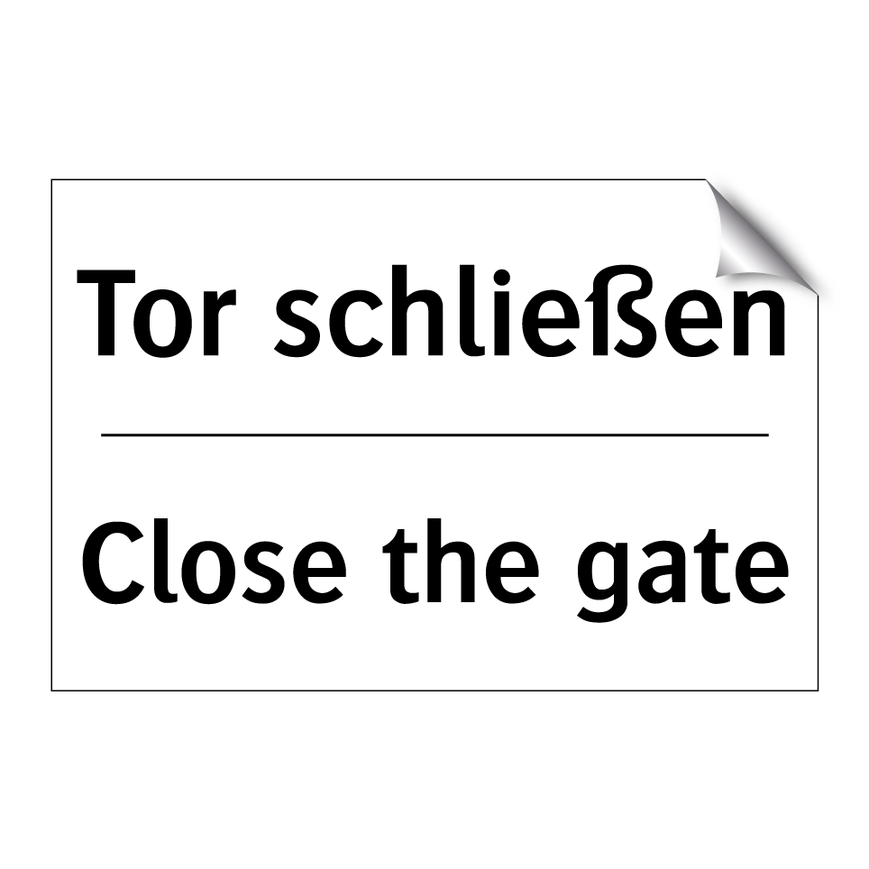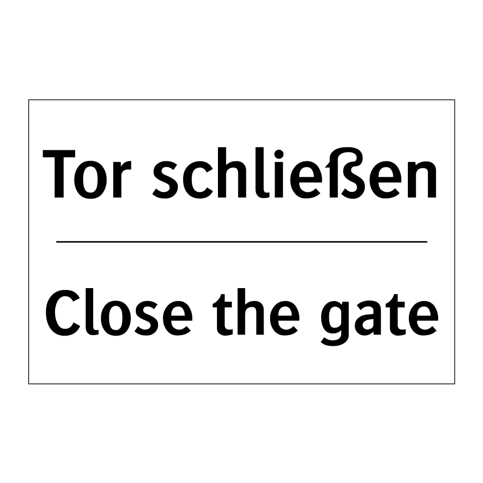 Zweisprachiges Verbotsschild mit deutschem Text Tor schließen und englischem Text Close the gate