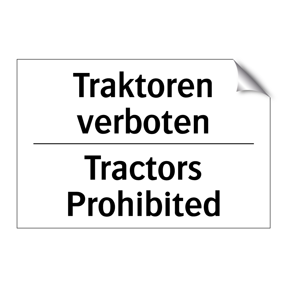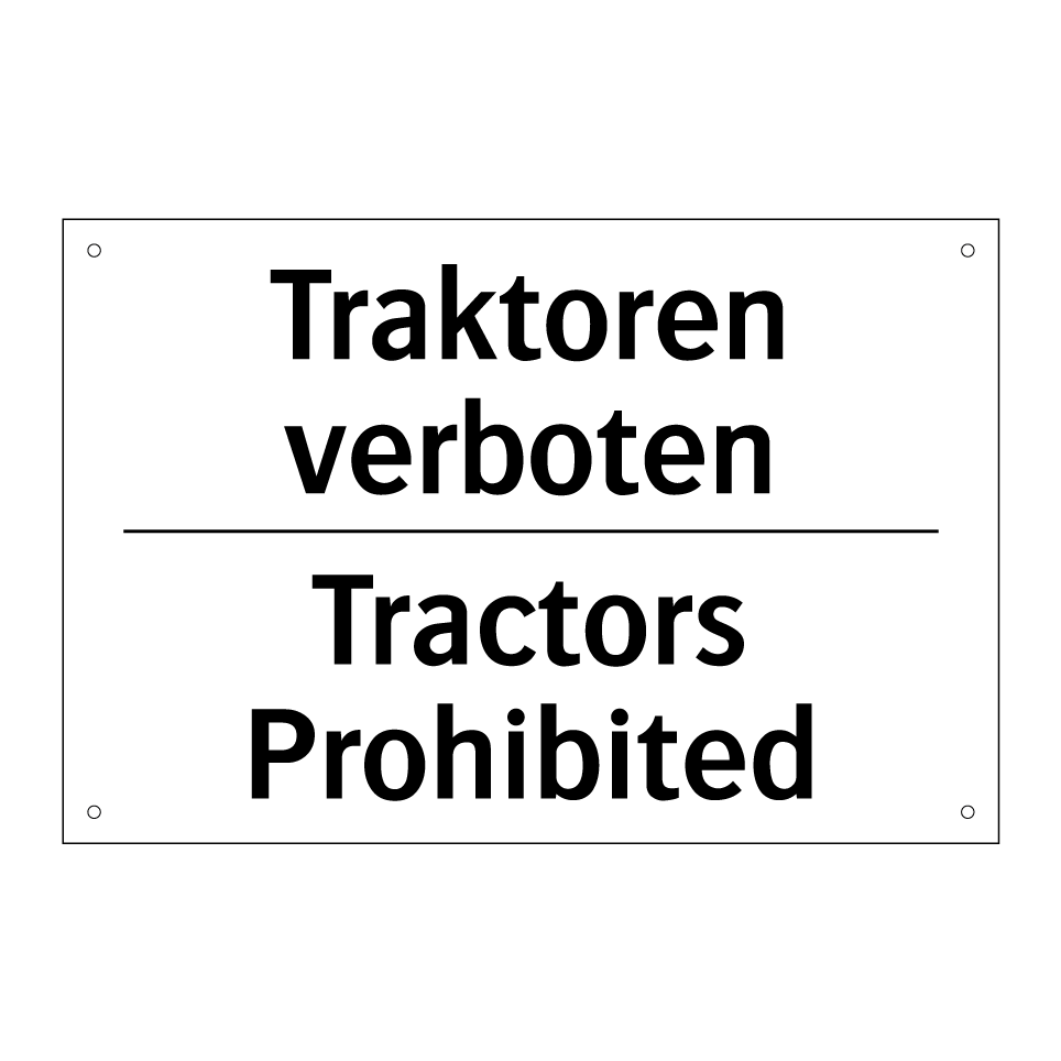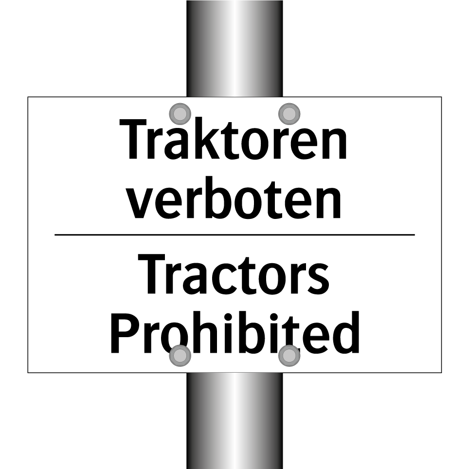 Zweisprachiges Verbotsschild mit deutschem Text Traktoren verboten und englischem Text Tractors Prohibited