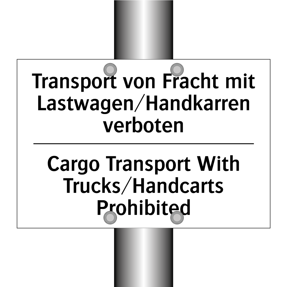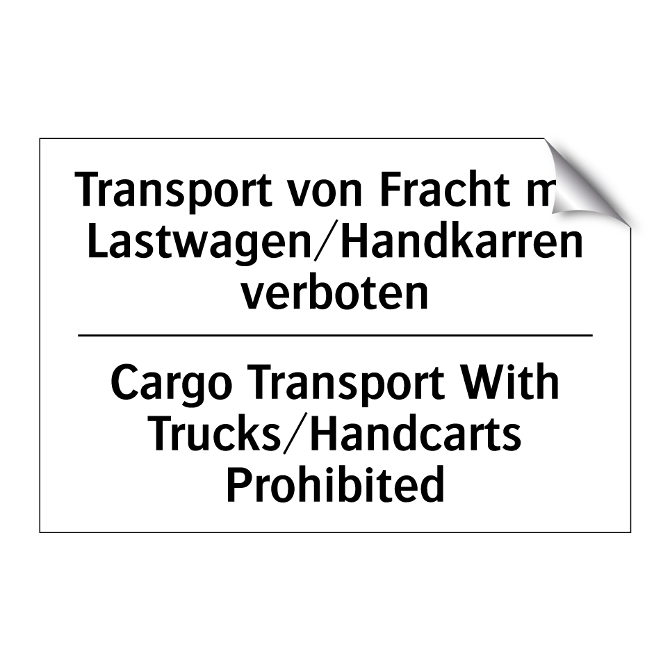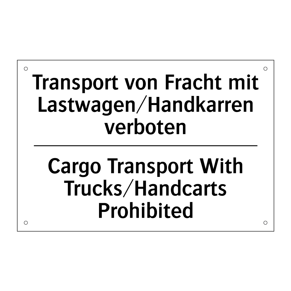 Zweisprachiges Verbotsschild mit deutschem Text Transport von Fracht mit Lastwagen/Handkarren verboten und englischem Text Cargo Transport With Trucks/Handcarts Prohibited