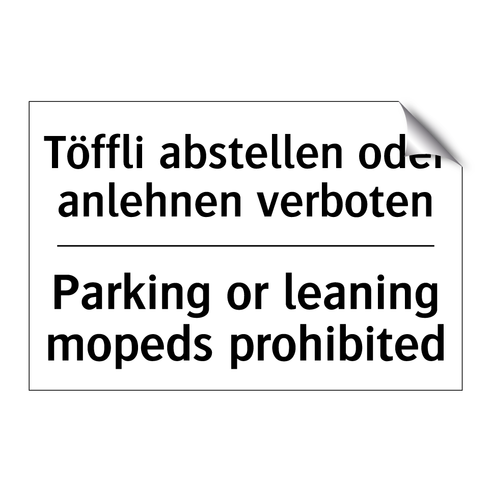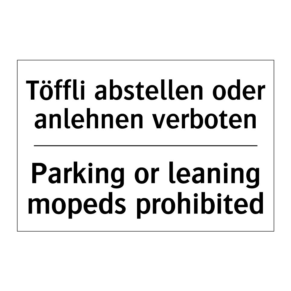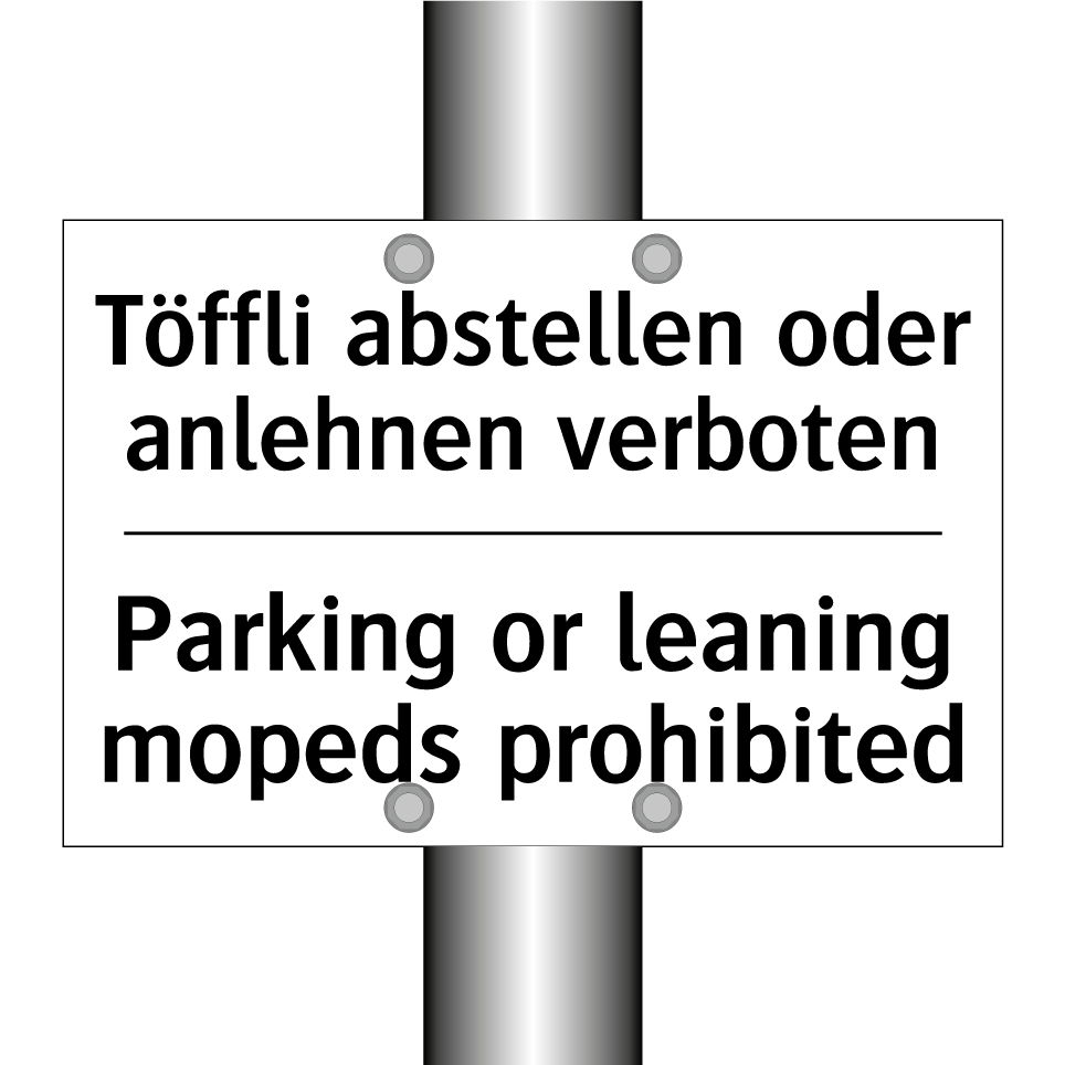 Zweisprachiges Verbotsschild mit deutschem Text Töffli abstellen oder anlehnen verboten und englischem Text Parking or leaning mopeds prohibited