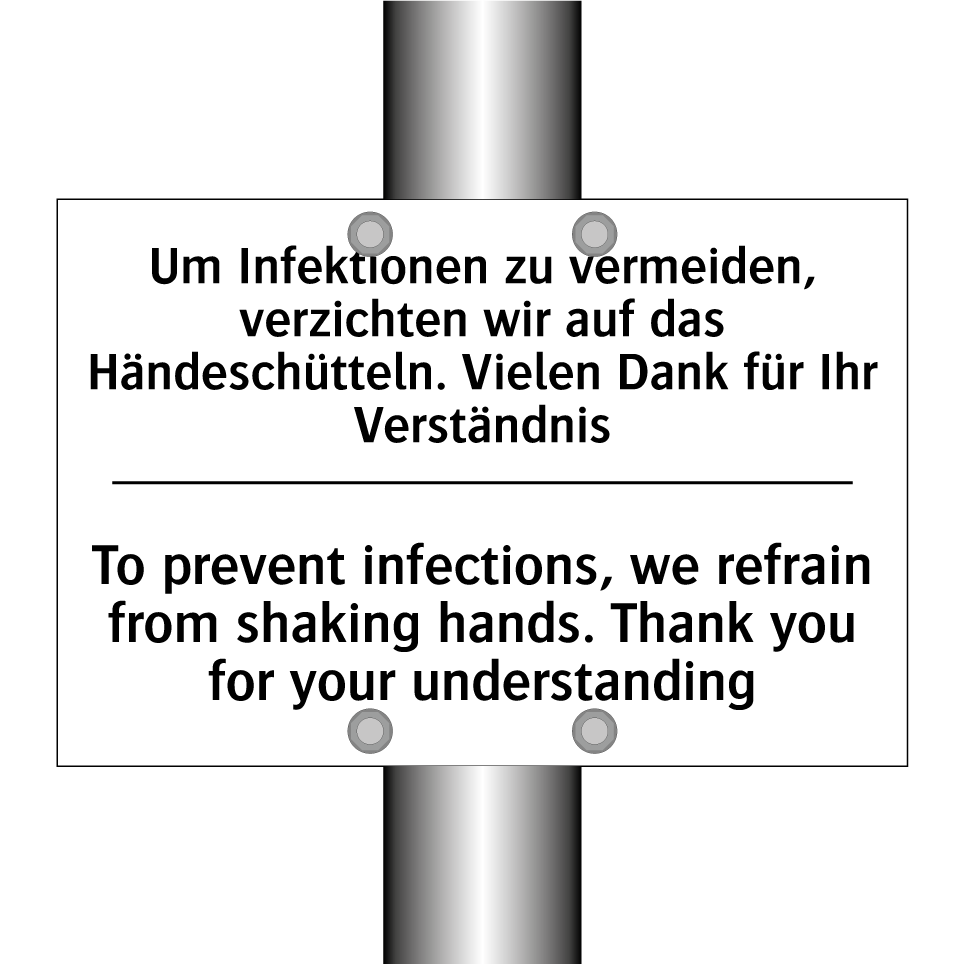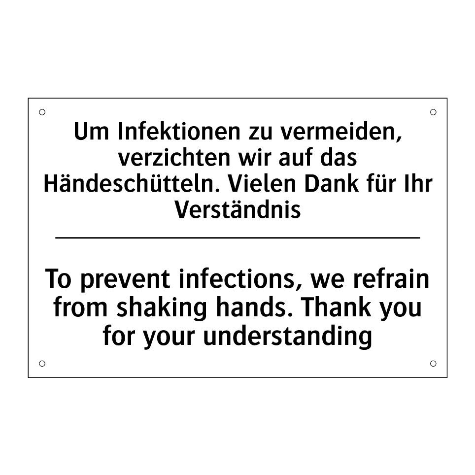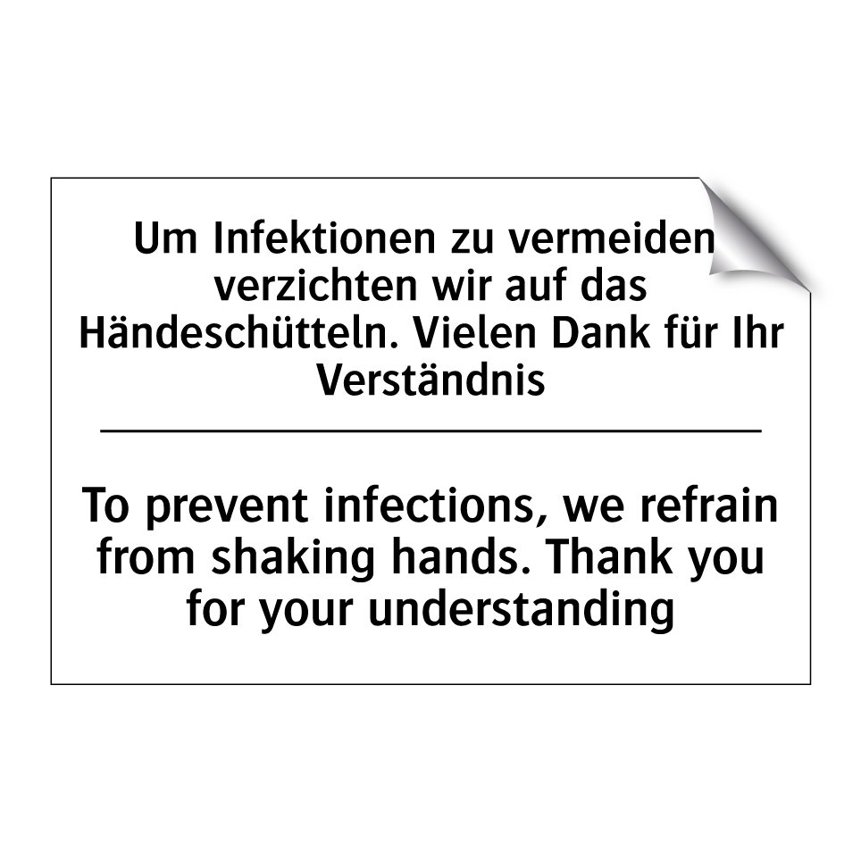 Zweisprachiges Verbotsschild mit deutschem Text Um Infektionen zu vermeiden, verzichten wir auf das Händeschütteln. Vielen Dank für Ihr Verständnis und englischem Text To prevent infections, we refrain from shaking hands. Thank you for your understanding