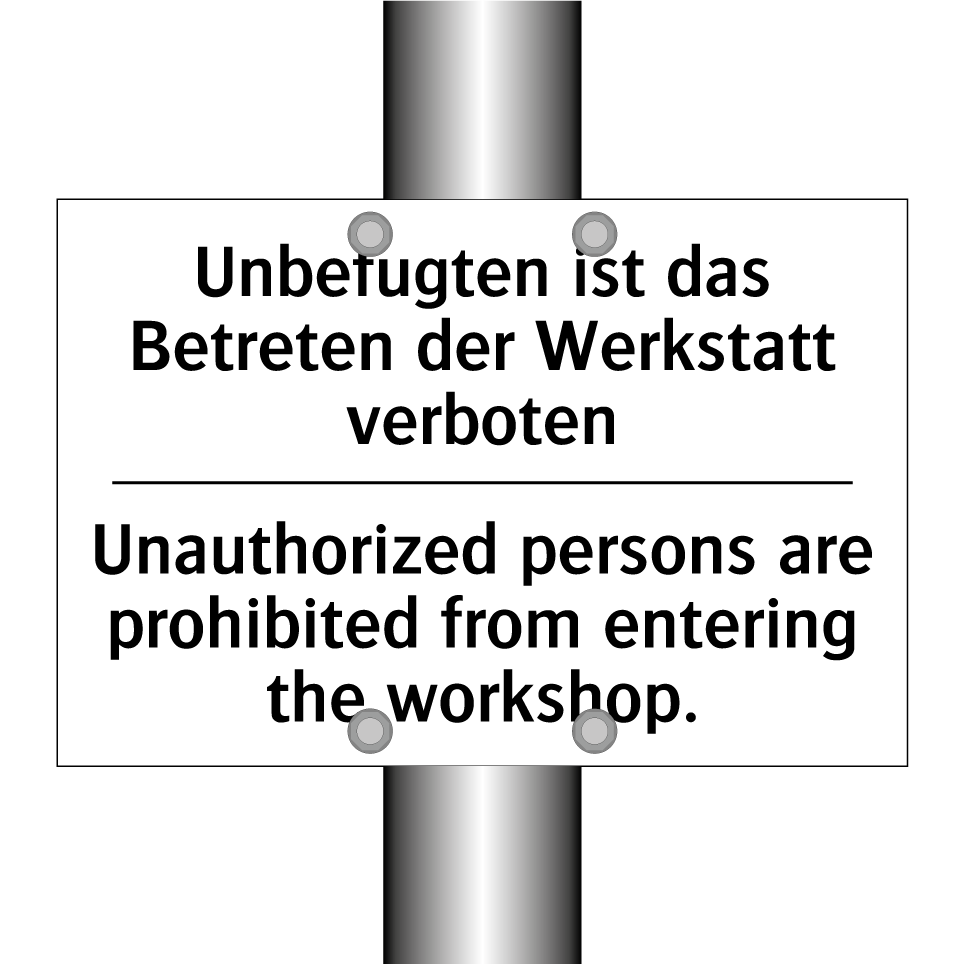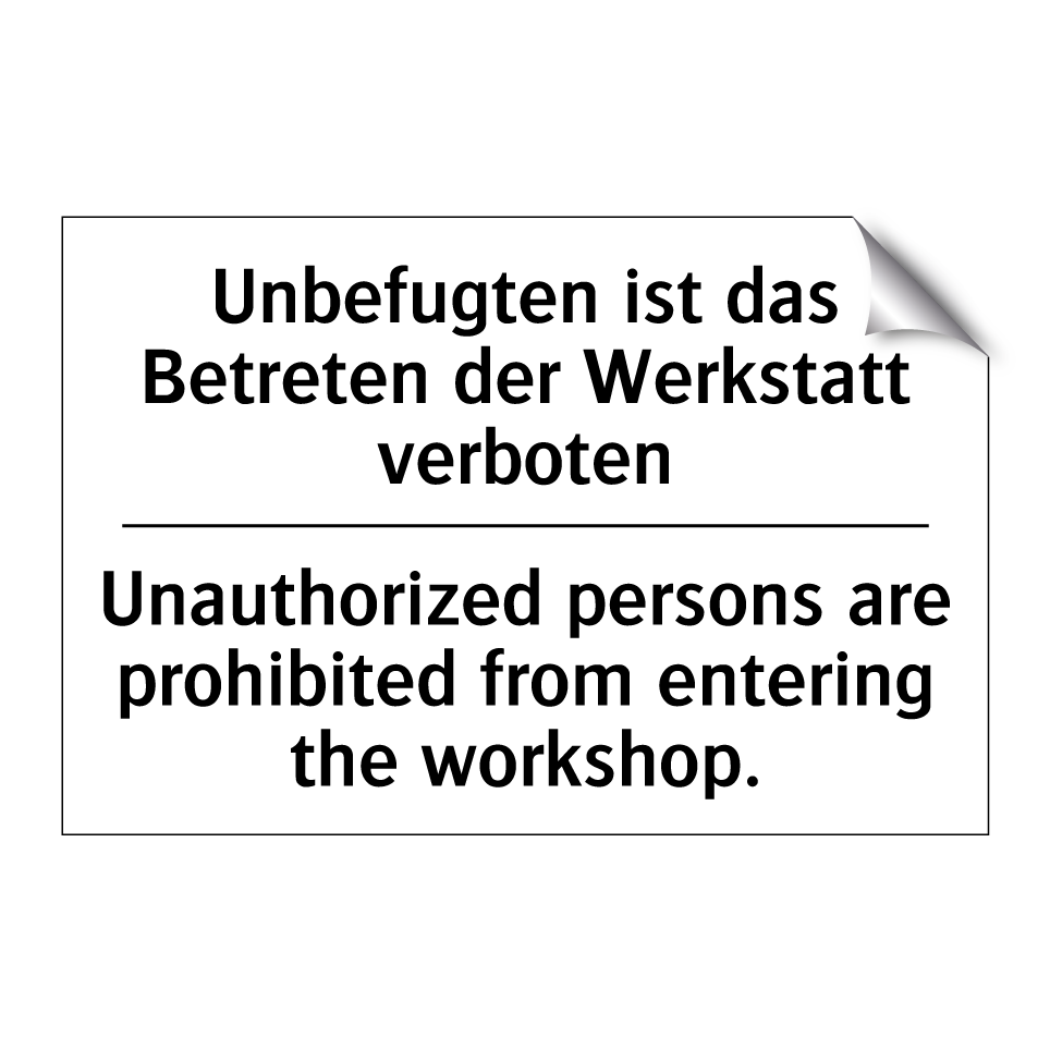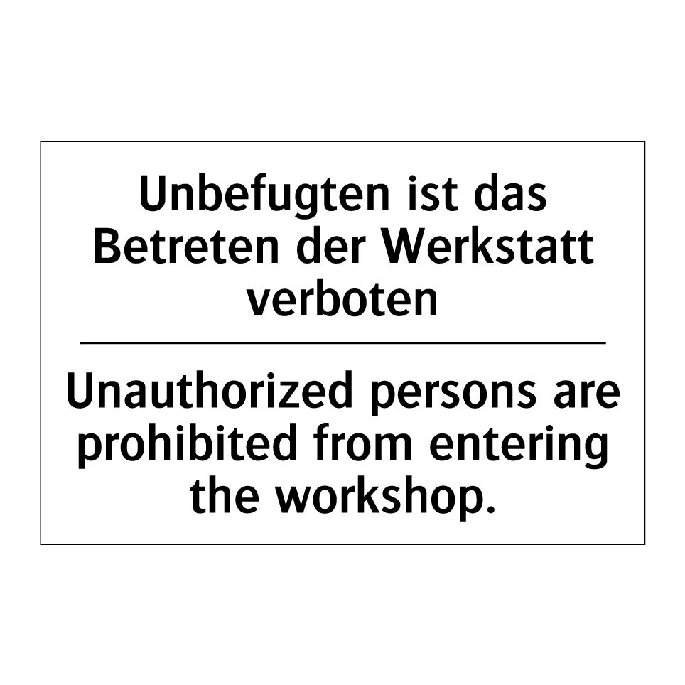 Zweisprachiges Verbotsschild mit deutschem Text Unbefugten ist das Betreten der Werkstatt verboten und englischem Text Unauthorized persons are prohibited from entering the workshop.